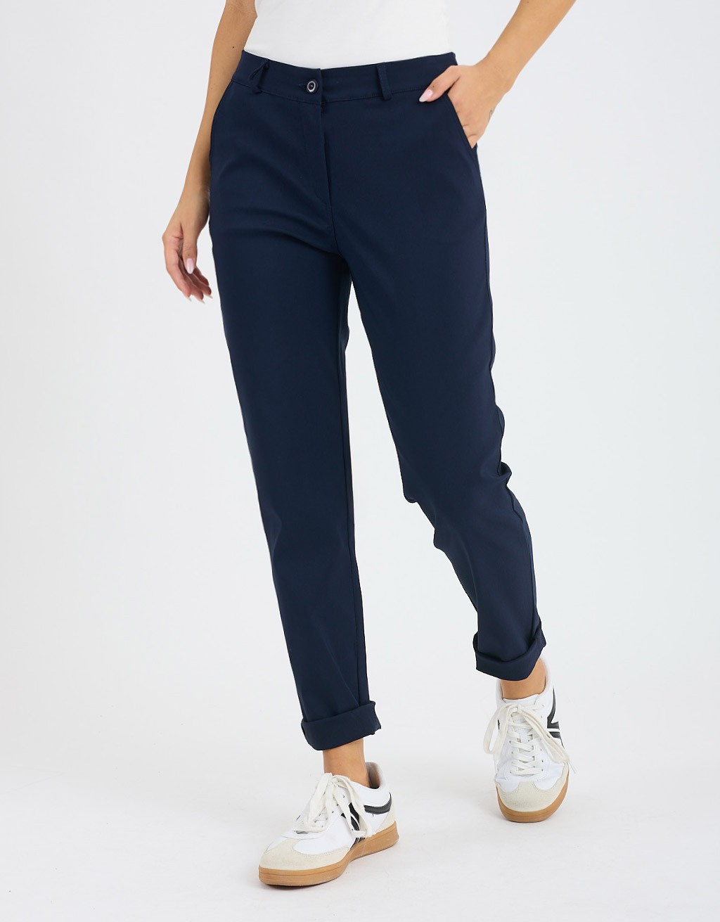 (Ogni 1,00 € speso = 1 punto)Pantalone basico dal tessuto elasticizzato in tinta unita. Tasche laterali e a filetto dietro. Chiusura con cerniera e bottone.