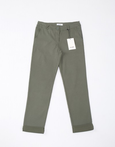 Pantalone basico dal tessuto elasticizzato in tinta unita. Tasche laterali e a filetto dietro. Chiusura con cerniera e bottone.
