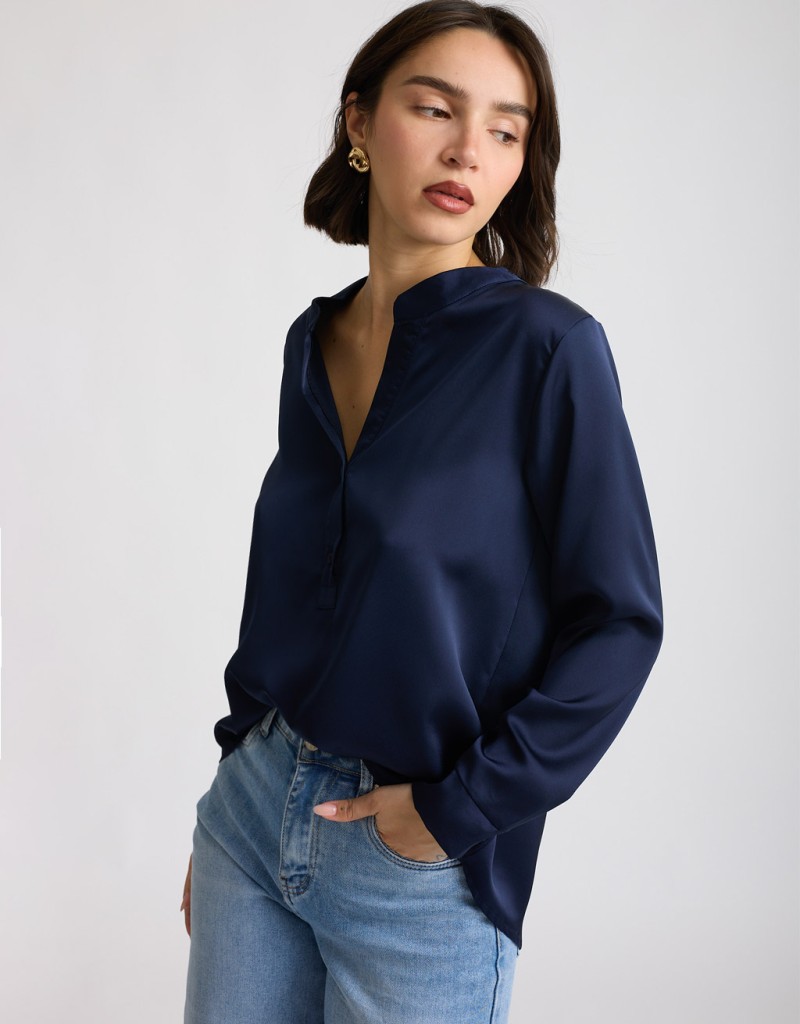 (Ogni 1,00 € speso = 1 punto)Blusa dal tessuto effetto raso con collo alla coreana e scollatura a V. Leggermente più lunga dietro, Vestibilità comoda.