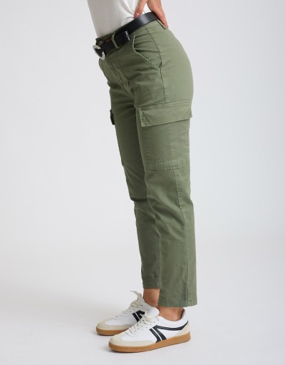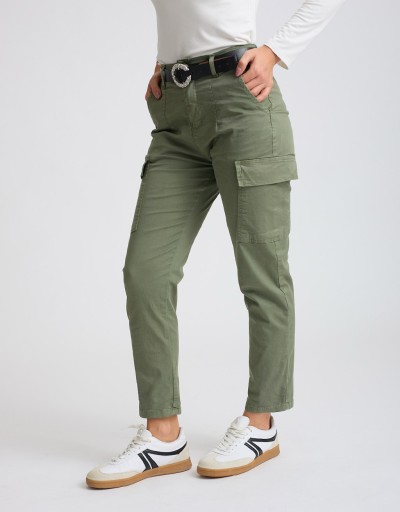 (Ogni 1,00 € speso = 1 punto)Pantalone in cotone leggero elasticizzato, chiusura frontale con bottone e cerniera e tasche con patta sulle gambe. Vestibilità regular.
