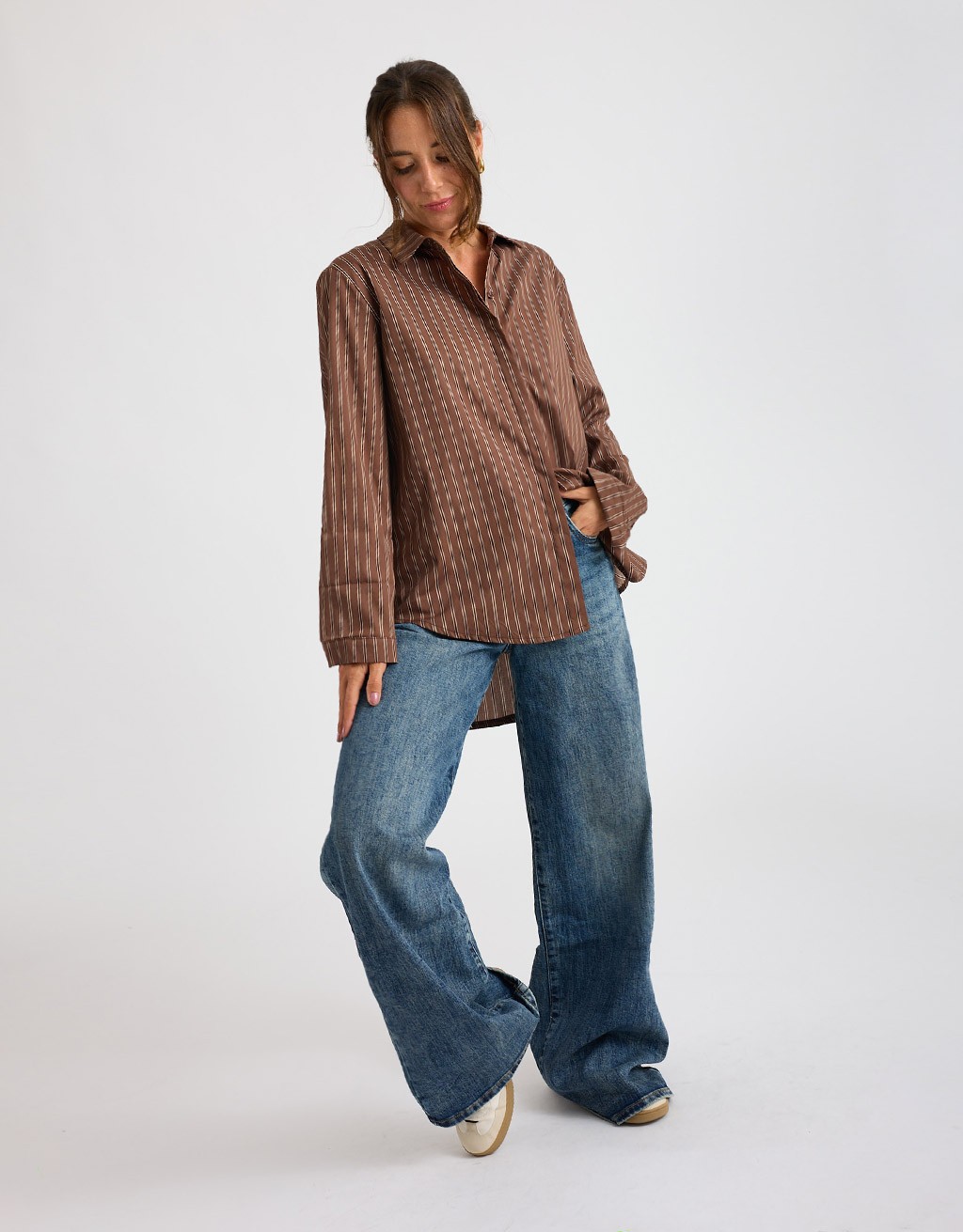 Camicia over a manica lunga in cotone a righe. Collo a revers e chiusura con bottoncini.