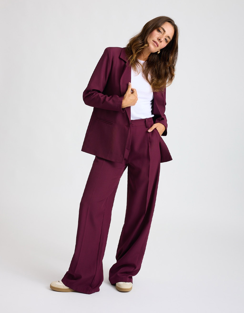 Pantalone dal tessuto elasticizzato in tinta unita, avita alta e gamba larga. Chiusura frontale con bottone e cerniera.