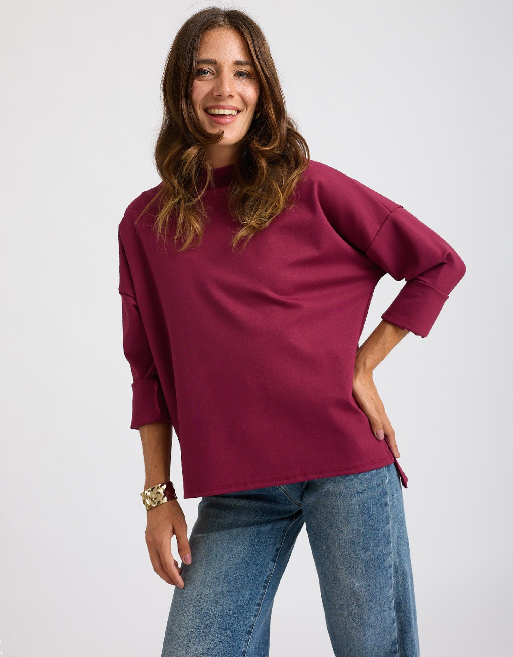 Maglia pesante tessuto elasticizzato in tinta unita con scollo a barca, manica lunga e spacchi laterali sul fondo. Leggermente più lunga dietro, vestibilità comoda. Si può abbinare con il  Pantalone Felpetta Baloon (30141), oppure Pantalone Felpetta Basic (30138)