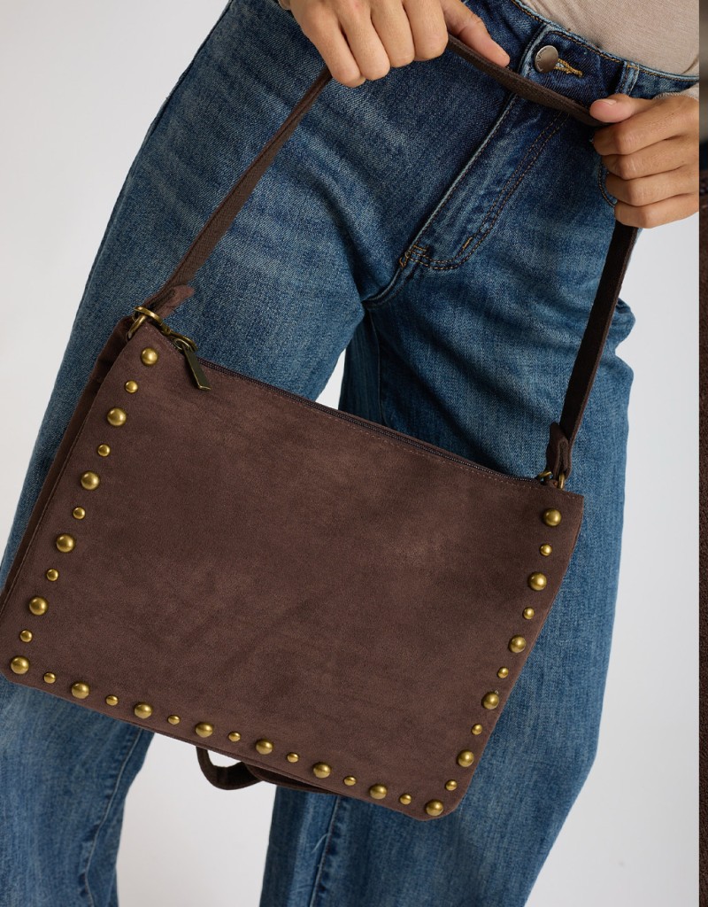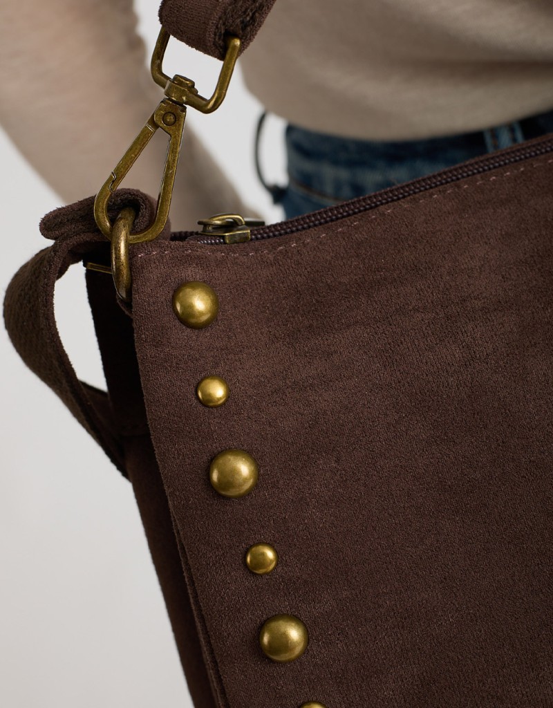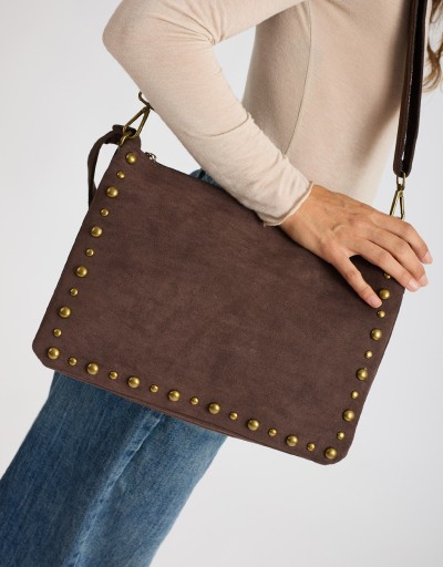 Borsa in tessuto effetto scamosciato con manico e tracolla in tessuto removibile. Chiusura con cerniera, dettaglio di borchie applicate lungo i bordi.