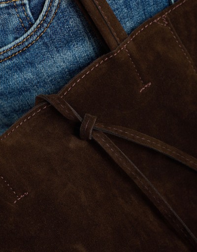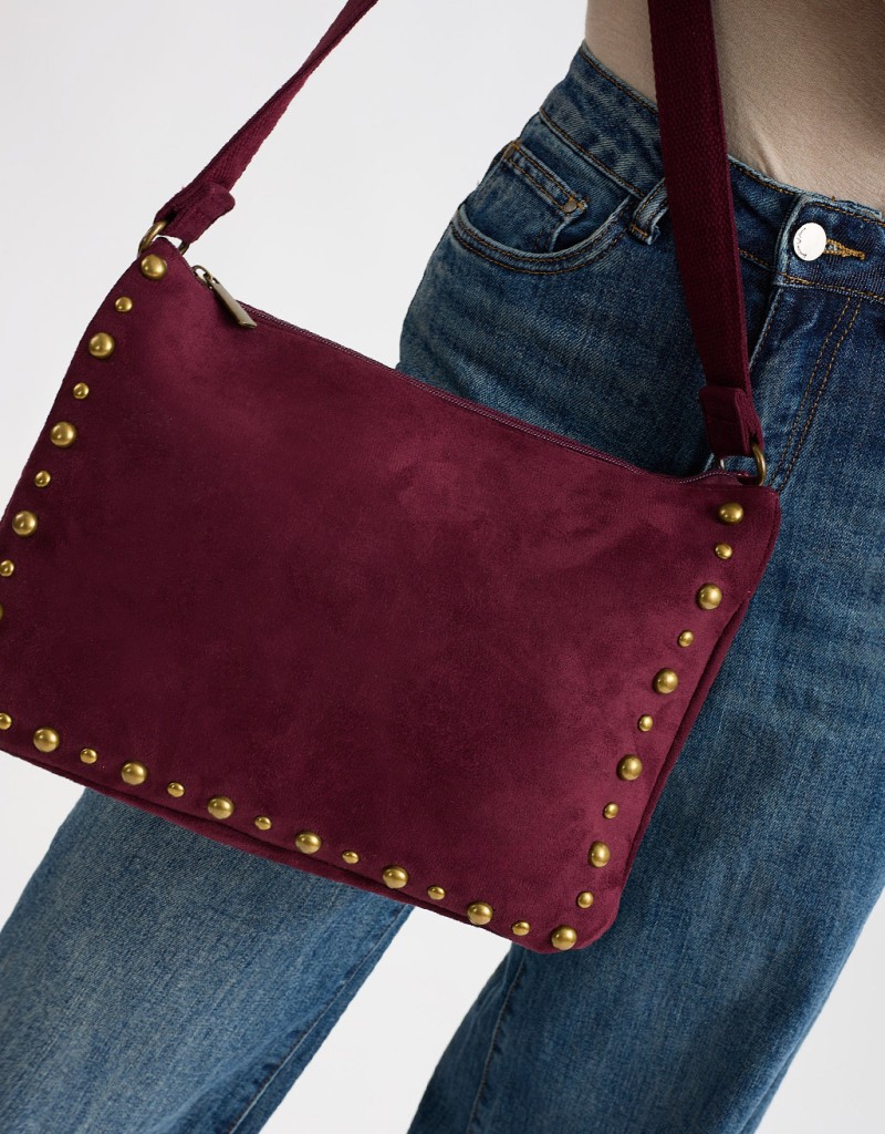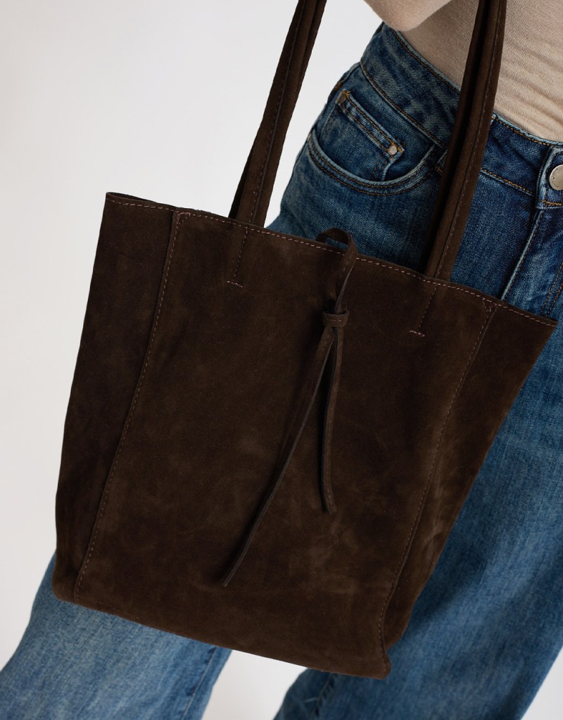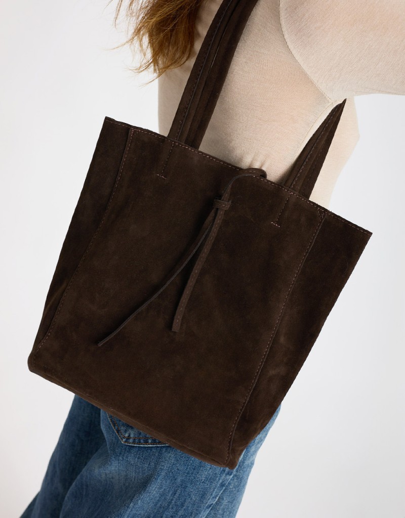 Borsa in tessuto effetto scamosciato. Con manici e tracolla staccabile. Chiusura con cerniera, dotata all'interno di una pochette removibile.