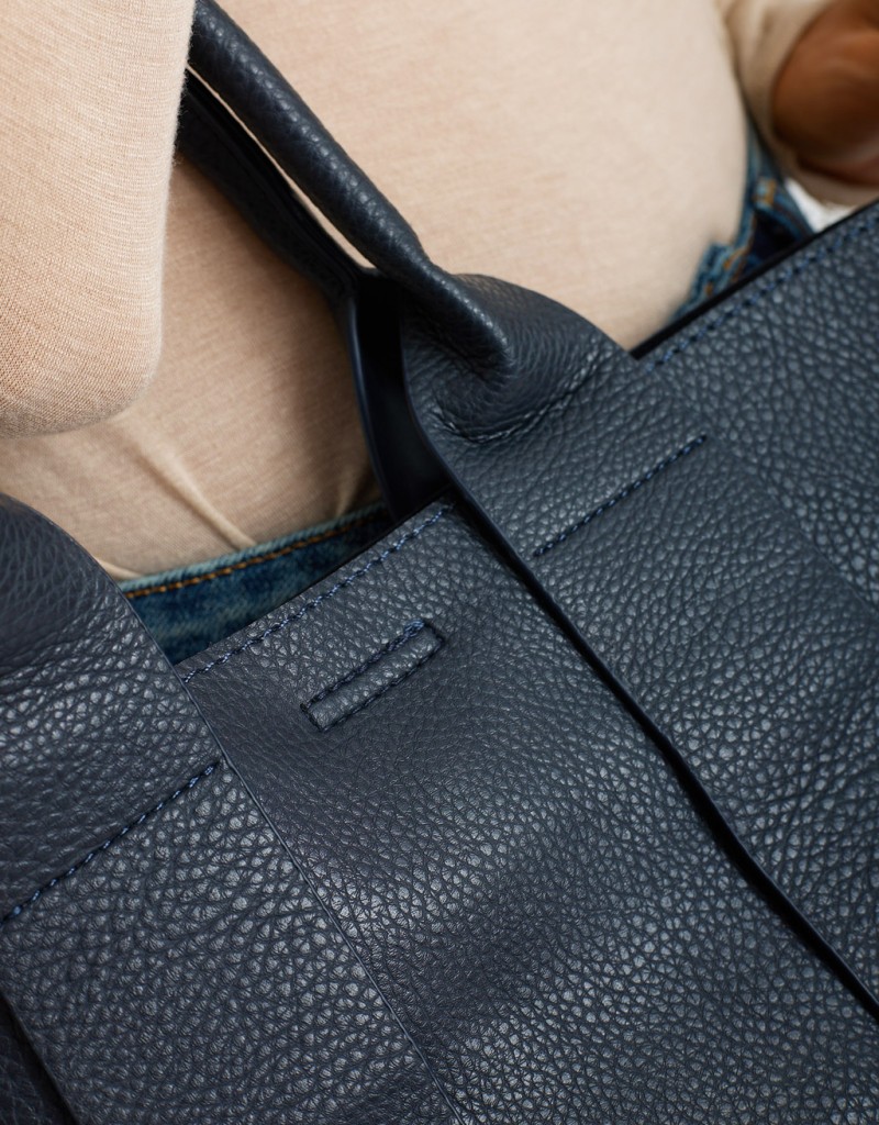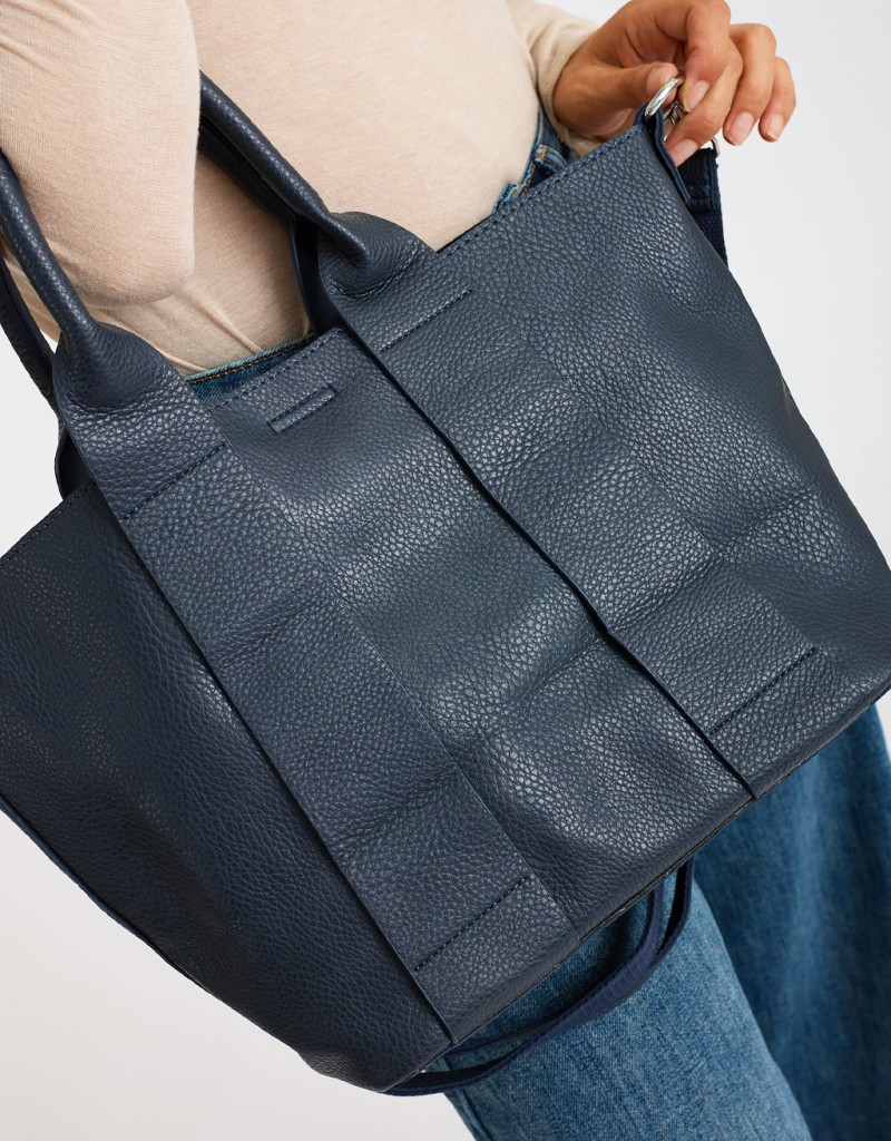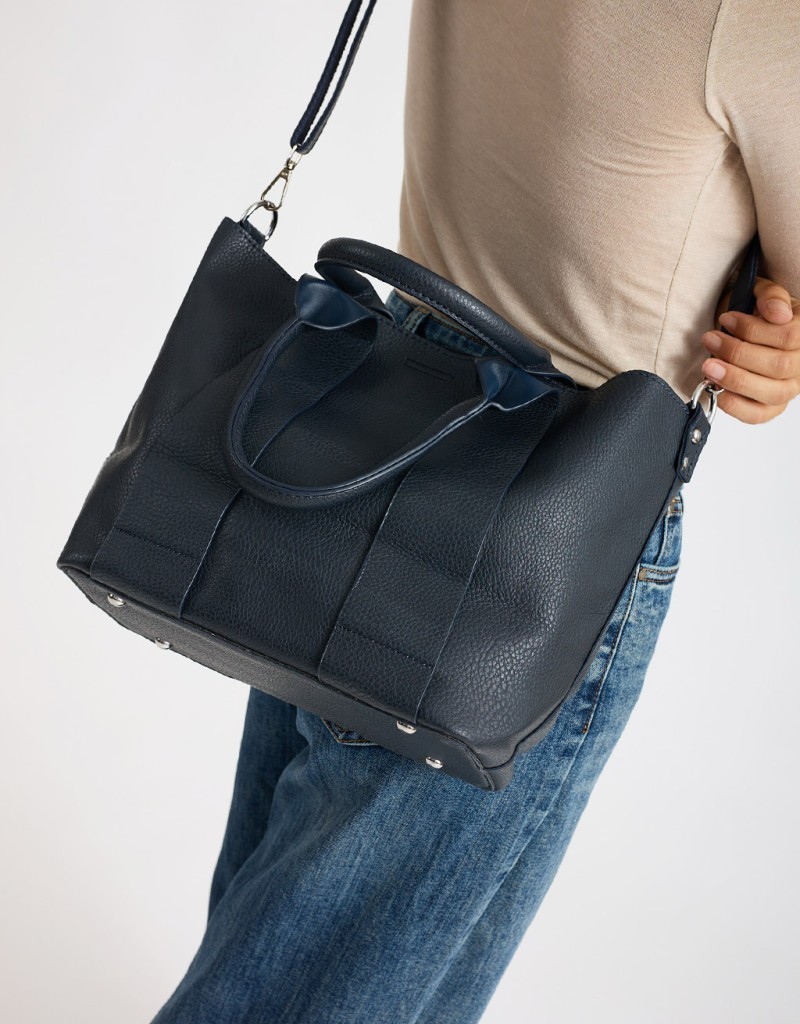 Borsa shopper in finta pelle con manici e tracolla in dotazione. Chiusura con cerniera e bottone a pressione.