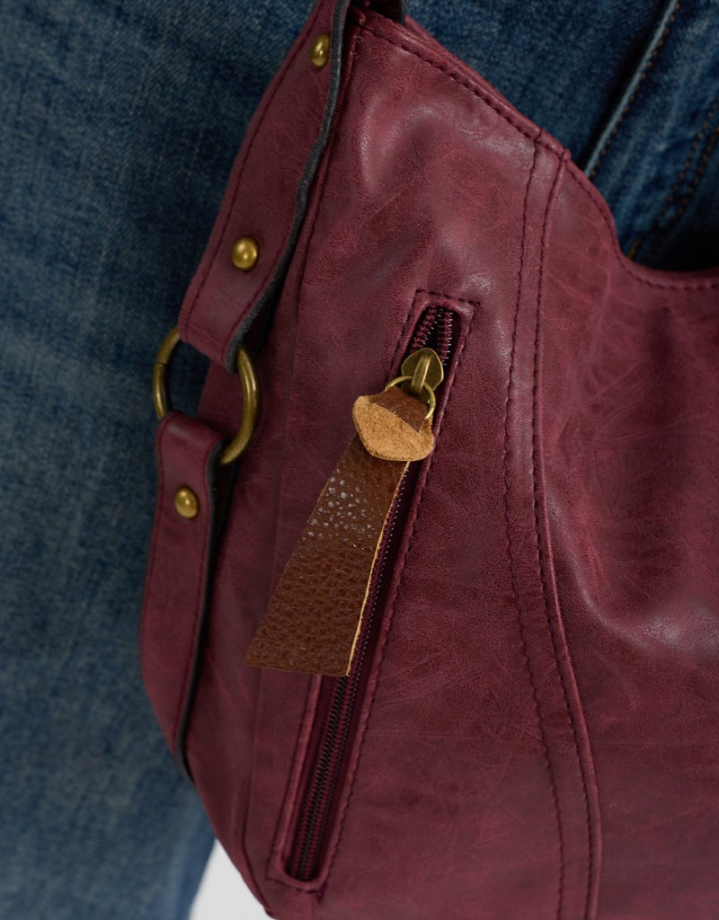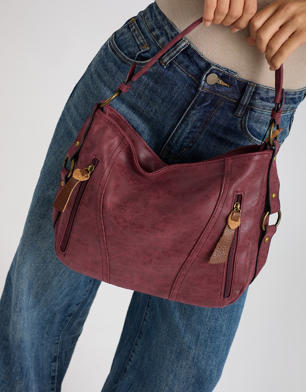 Borsa a spalla in finta pelle con chiusura a cerniera. Frontalmente presenti due tasche chiuse da cerniere. Taschina esterna con cerniera. Internamente è presente una fodera con taschine. Tracolla.