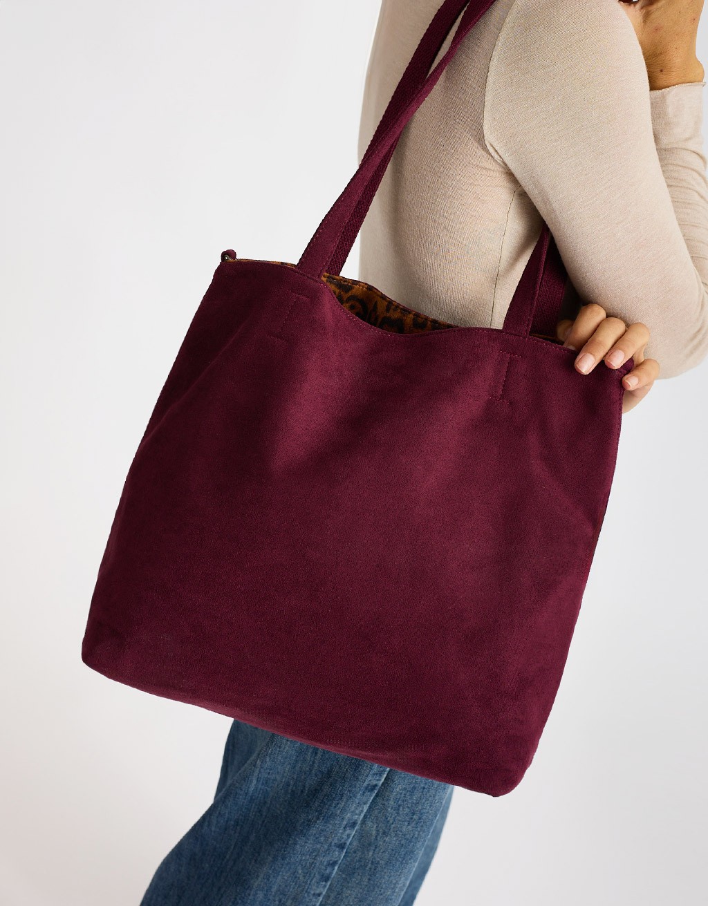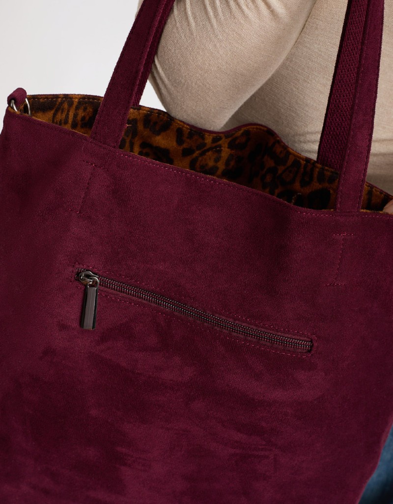 Borsa double face, può essere utilizzata in due modi in tinta unita oppure nella versione animalier. Chiusura con calamita, dotata di manici e tracolla staccabile.
