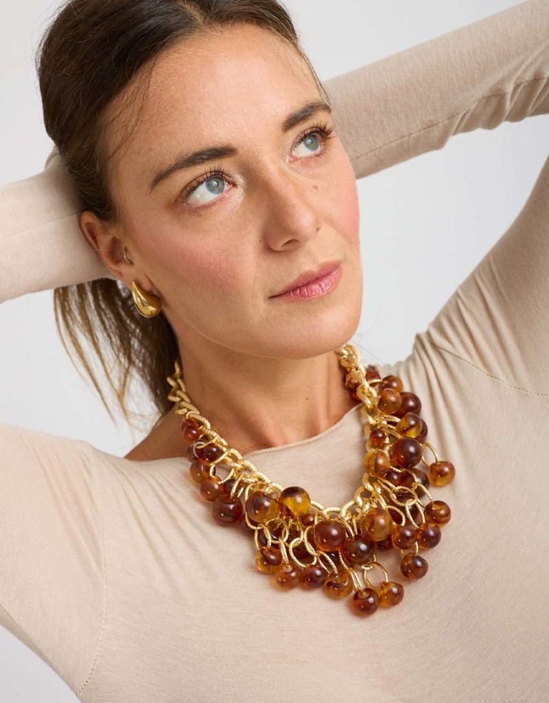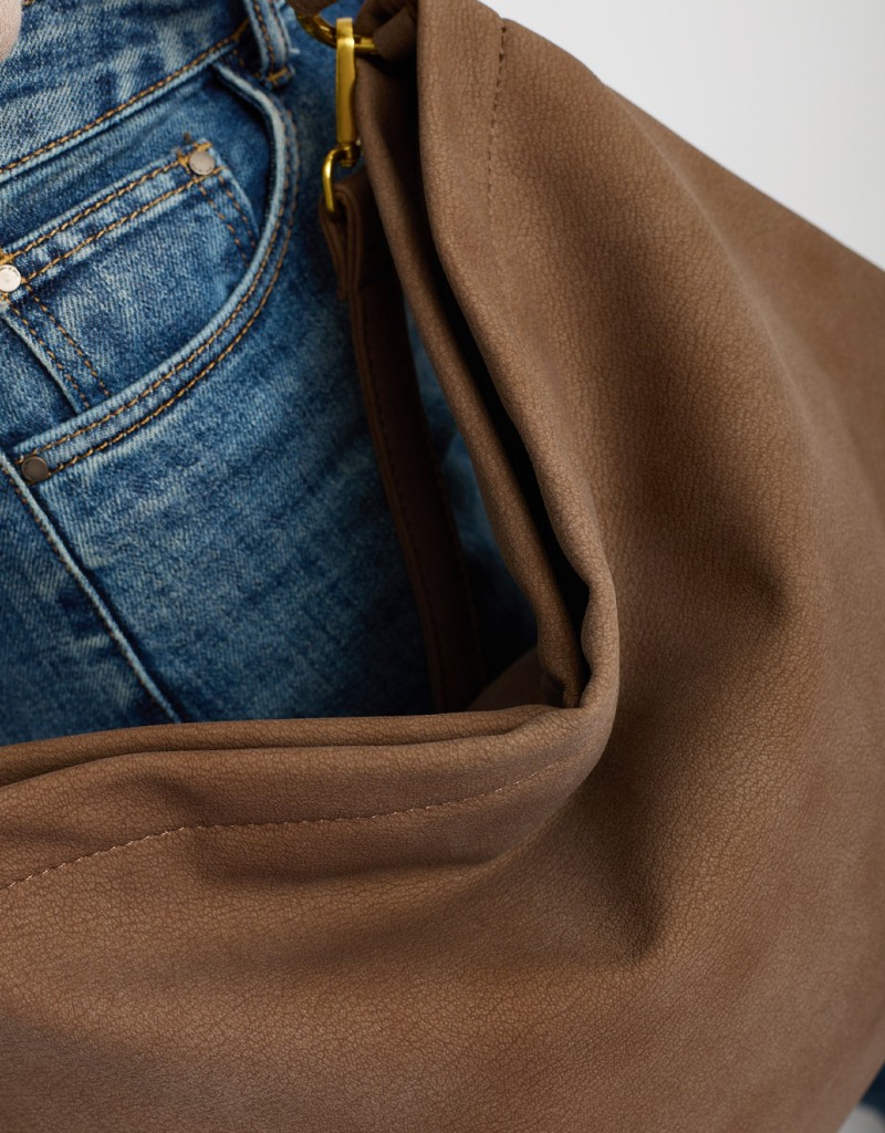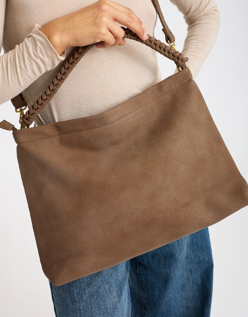 Borsa a spalla in finta pelle con manico a treccia, chiusura con cerniera. Internamente presenta una fodera con due tasche, una con cerniera. Tracolla.