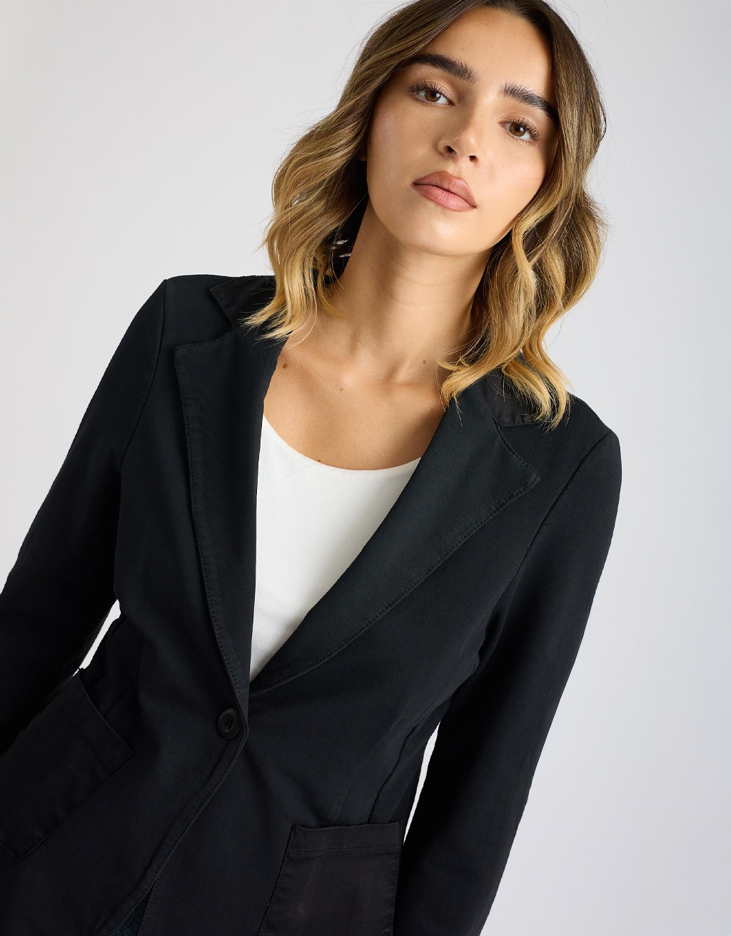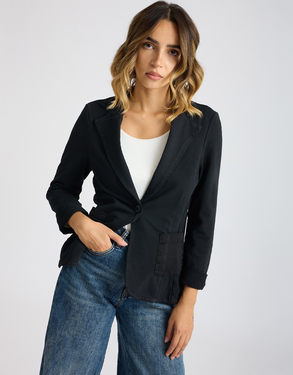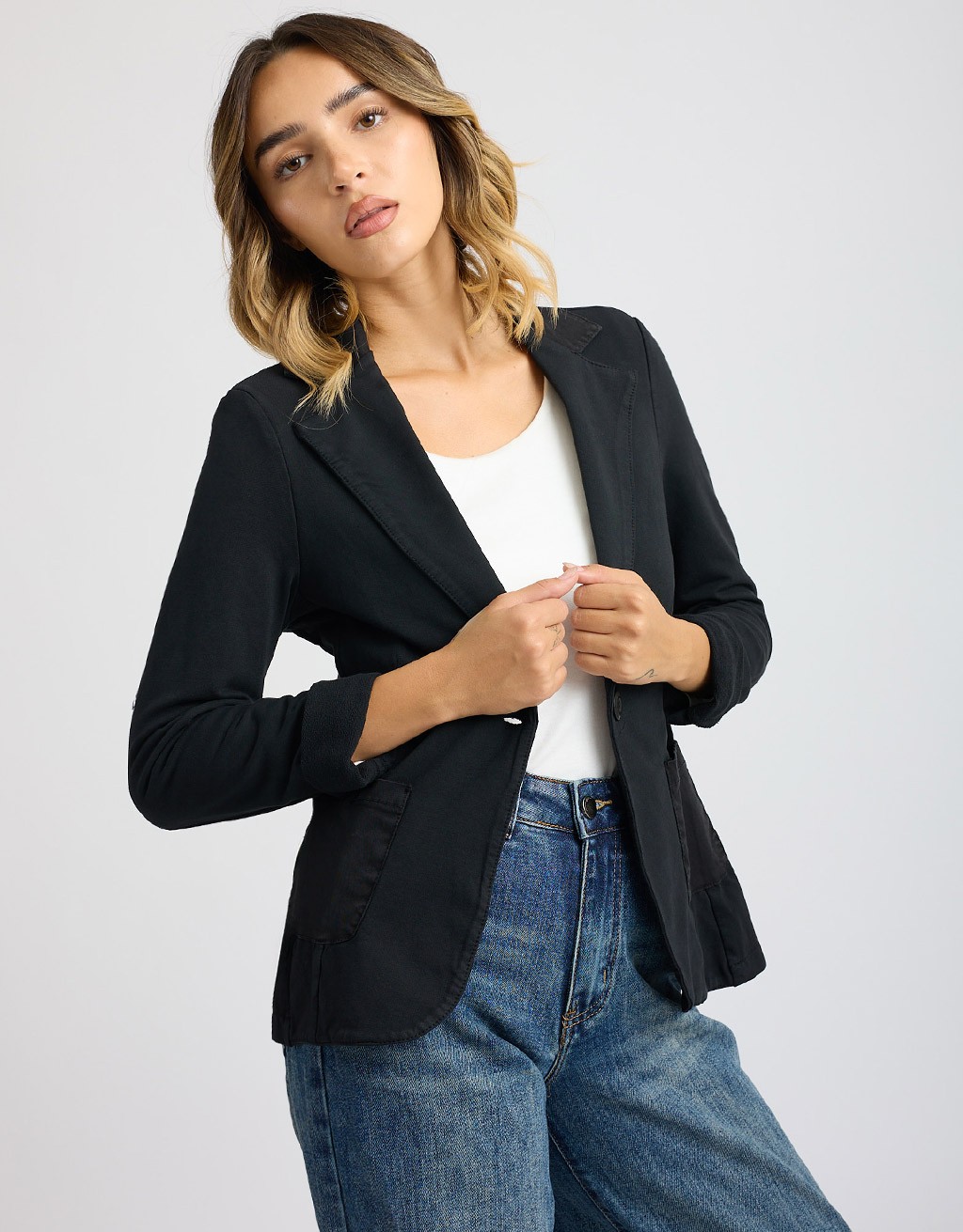 (Ogni 1,00 € speso = 1 punto)Giacca in felpa elasticizzata, con collo a revers e chiusura frontale ad un bottone. Tasche in gabardina frontali, modello sfiancato.
