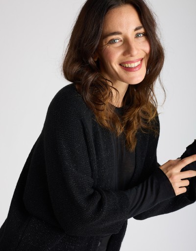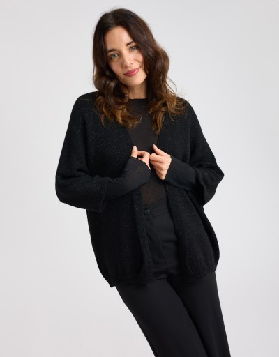 Cardigan aperto, lunghezza midi dal morbido tessuto in tinta unita con fili lurex. Vestibilità morbida.