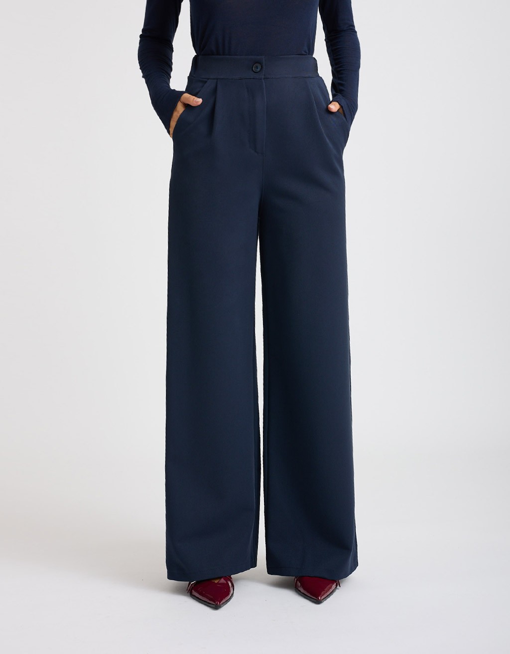 Pantalone dal morbido tessuto in mano lana tinta unita a vita alta e gamba larga. Pinces frontale, chiusura con bottone e cerniera ed elastico nel retro. Può essere abbinata alla giacca basica elegante cod. 30100