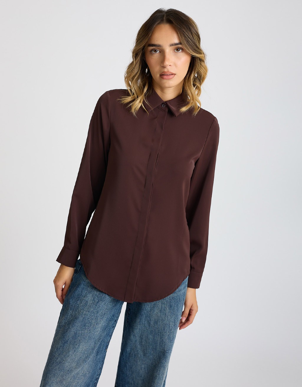 Camicia dal tessuto effetto lucido in tinta unita, chiusura frontale con bottoni nascosti.