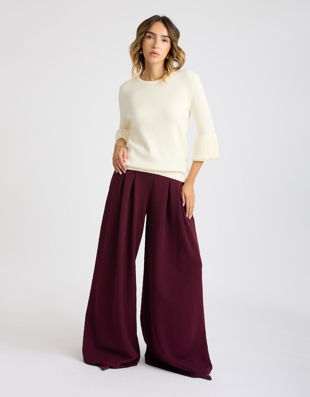 (Ogni 1,00 € speso = 1 punto)Maglioncino dal morbido e caldo tessuto in misto viscosa tinta unita. Scollatura a giro e manica lunga a campana con perle applicate sulle estremità.