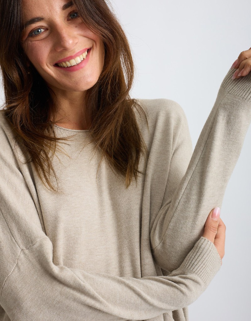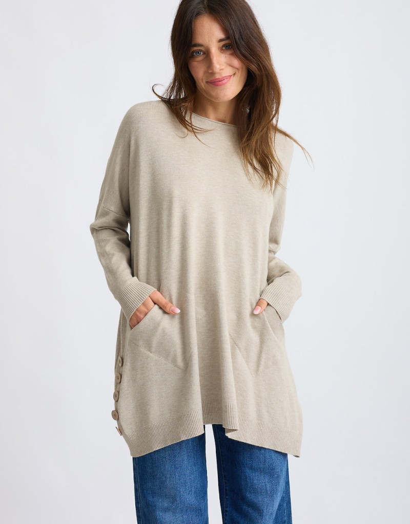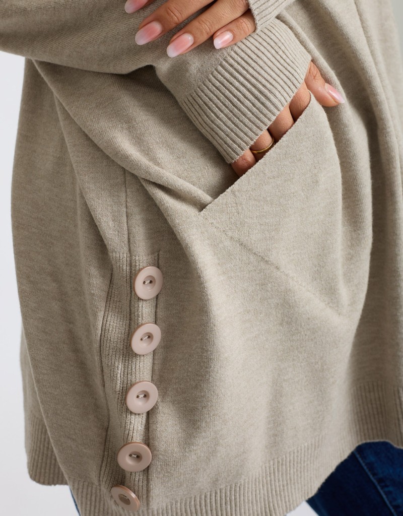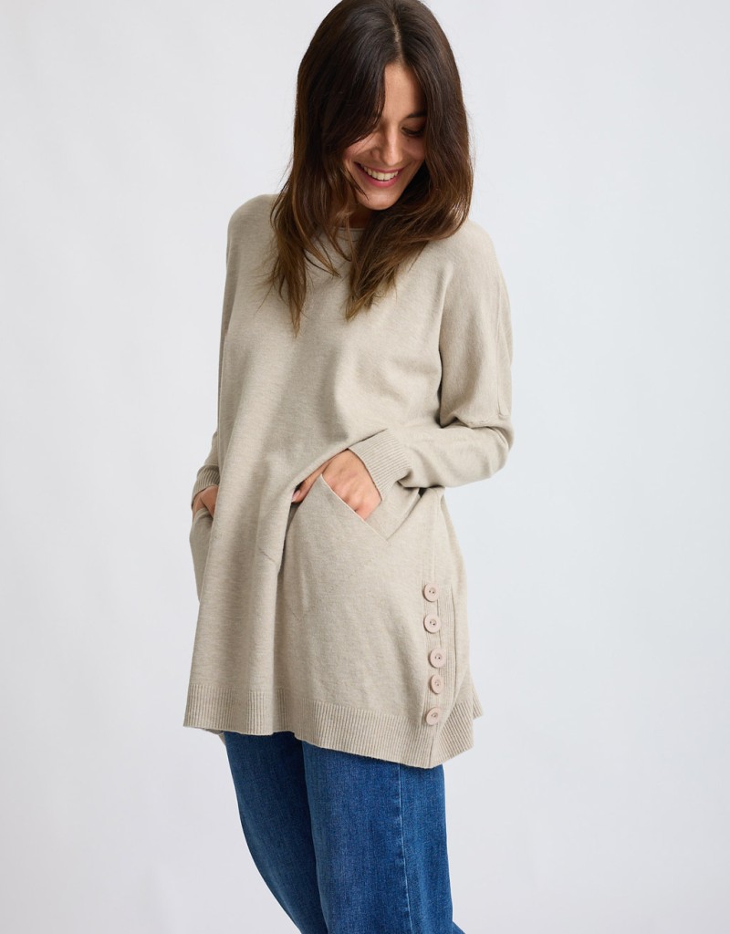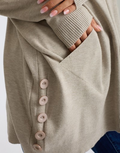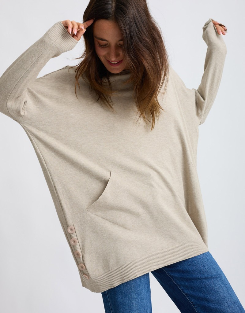 Maglioncino maxi in morbido tessuto elasticizzato con scollatura a giro. Presenta 2 tasche frontali e dei bottoni laterali. Vestibilità comoda.
