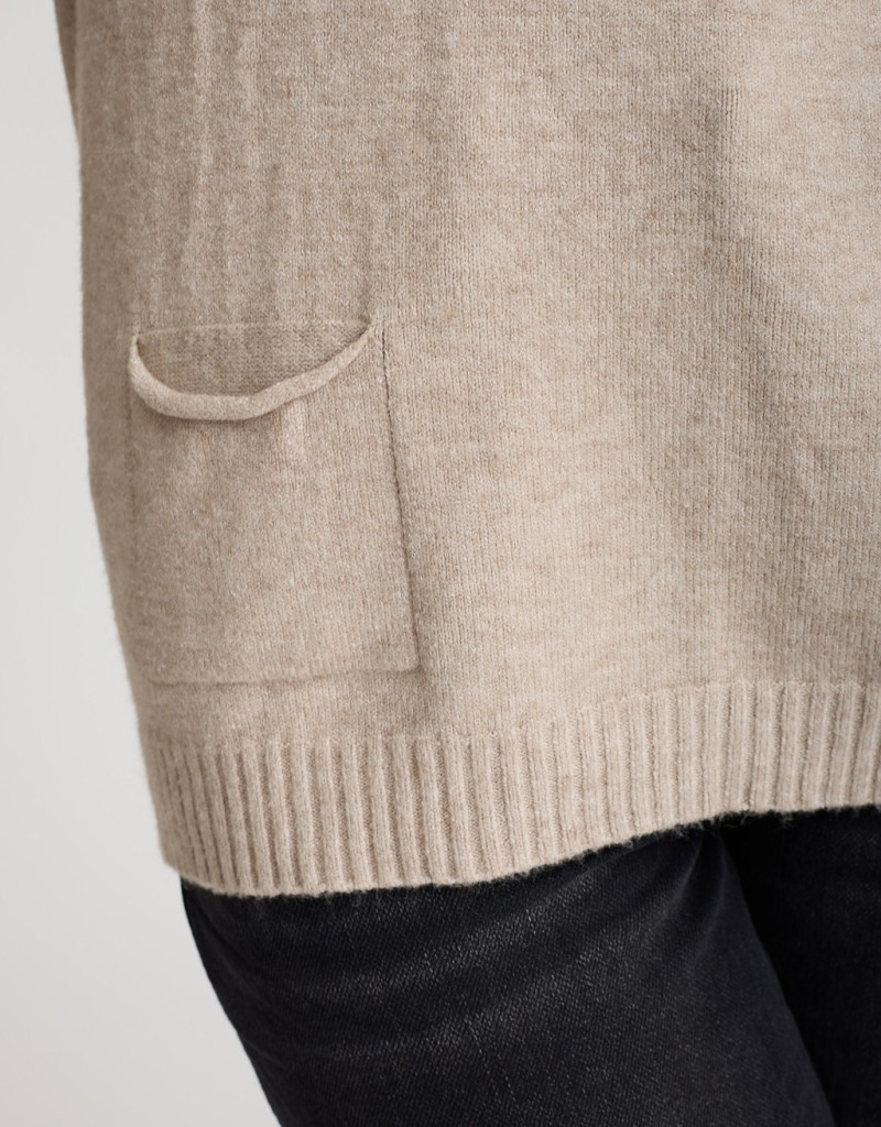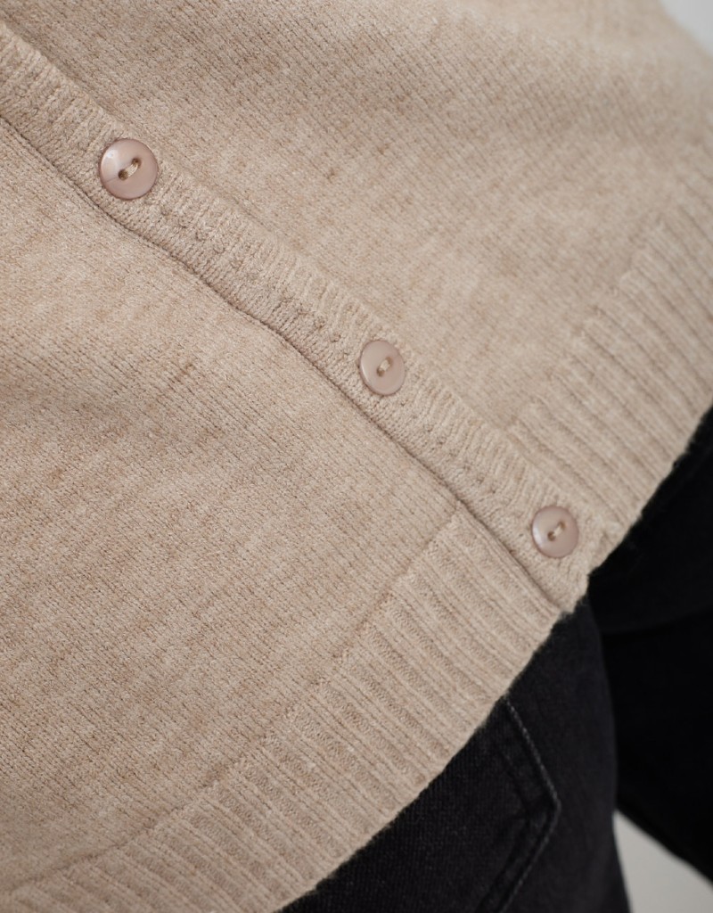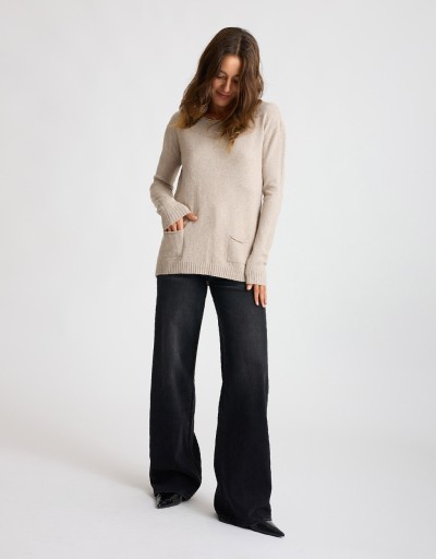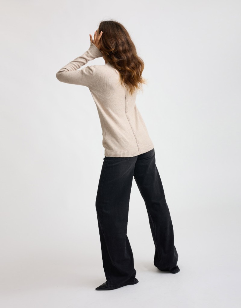 Maglioncino dal morbido tessuto in tinta unita con scollatura a giro e tasche frontali. Dettaglio di bottoni cuciti dietro sulla schiena.
