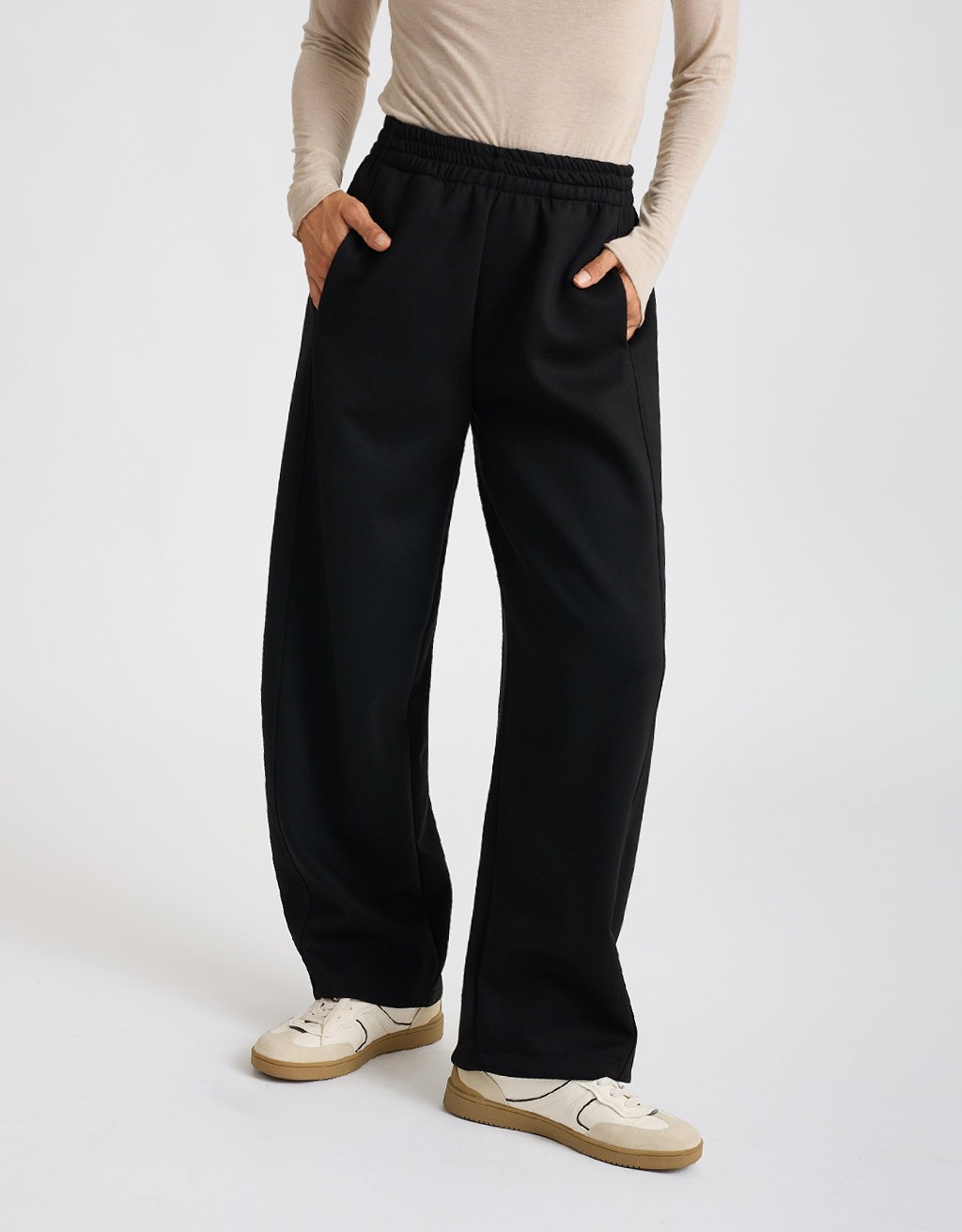Pantalone dal taglio ampio in morbido tessuto in tinta unita con elastico in vita che ne adatta la vestibilità. Tasche frontali a filetto. Volendo può essere abbinato alla Felpetta Scuba cod. 30343 o alla Giacca Scuba Zip cod. 30342