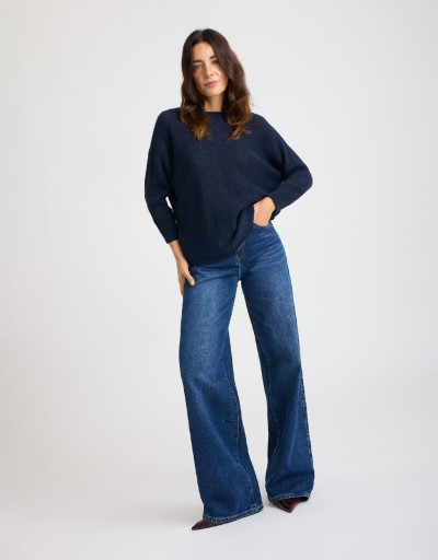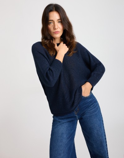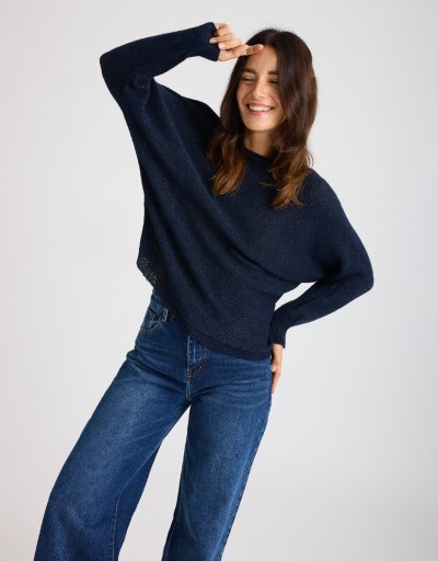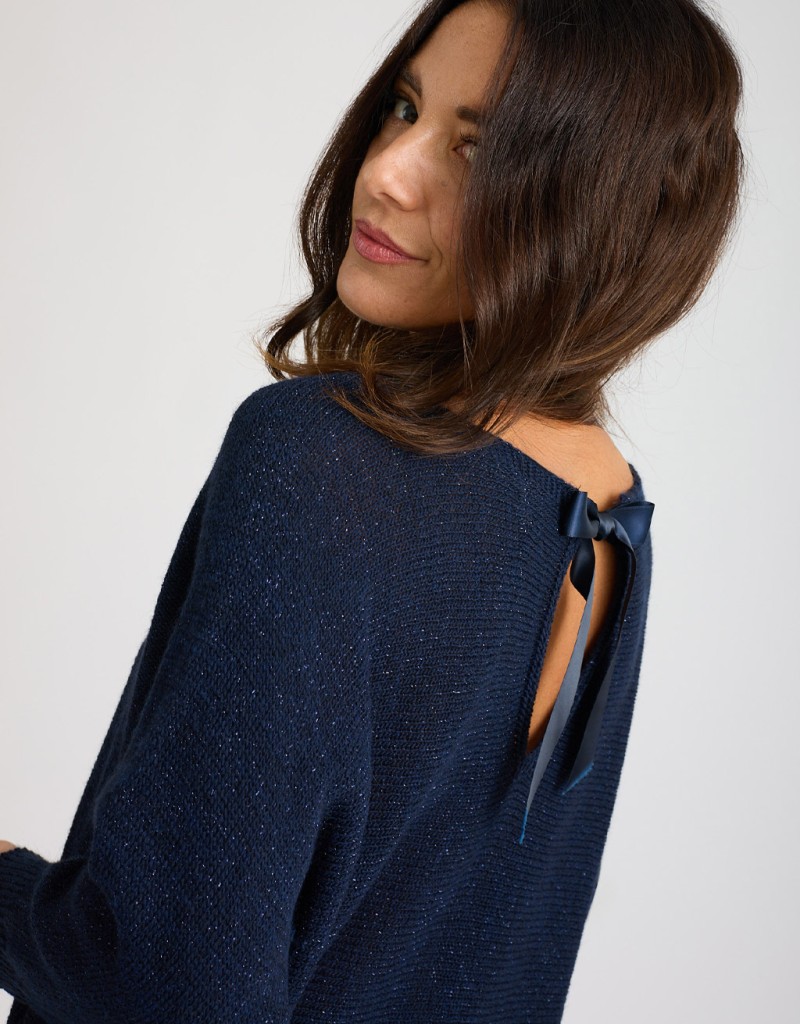 Maglione in morbido e caldo tessuto tinta unita con fili lurex. Dettaglio di fiocco in raso allacciato dietro sul collo, scollatura a goccia sulla schiena. Vestibilità comoda.