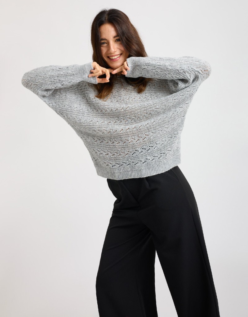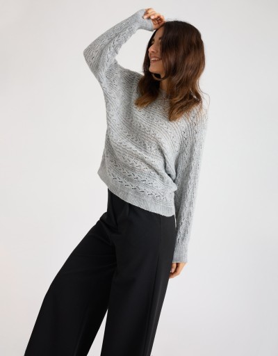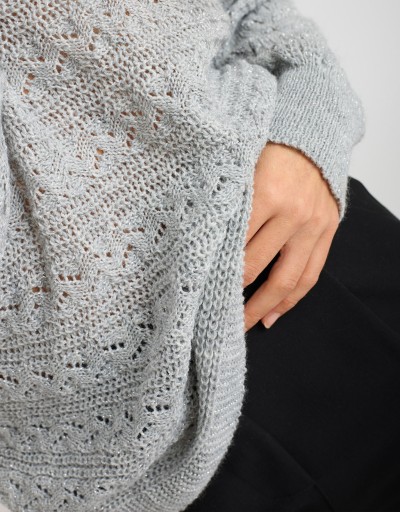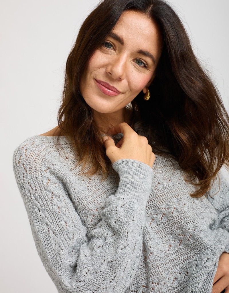 Maglione dal morbido e caldo tessuto in tinta unita con fili lurex e lavorazione a treccia. Ampia scollatura a giro, vestibilità morbida.