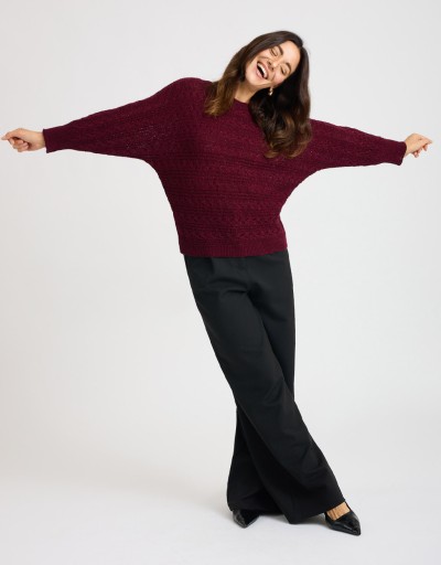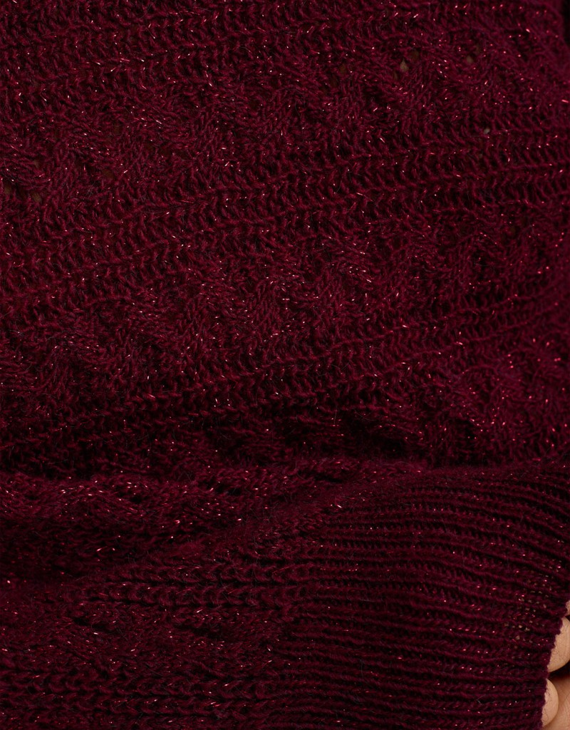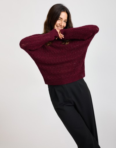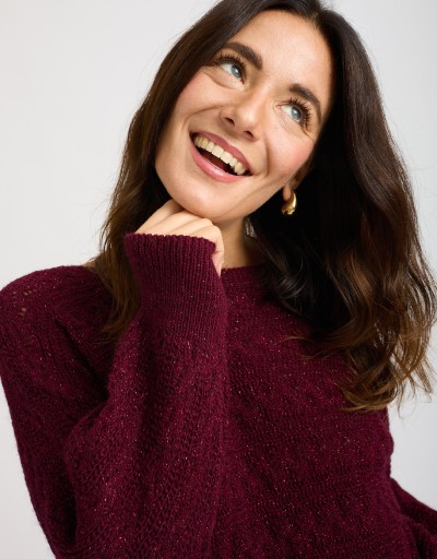 (Ogni 1,00 € speso = 1 punto)Maglione dal morbido e caldo tessuto in tinta unita con fili lurex e lavorazione a treccia. Ampia scollatura a giro, vestibilità morbida.