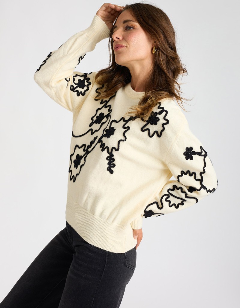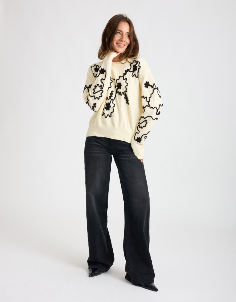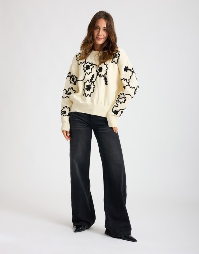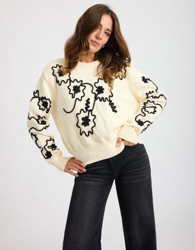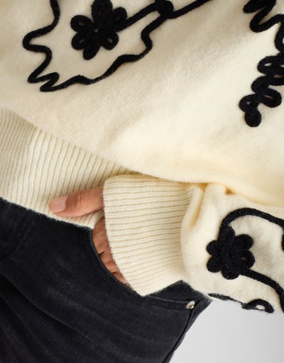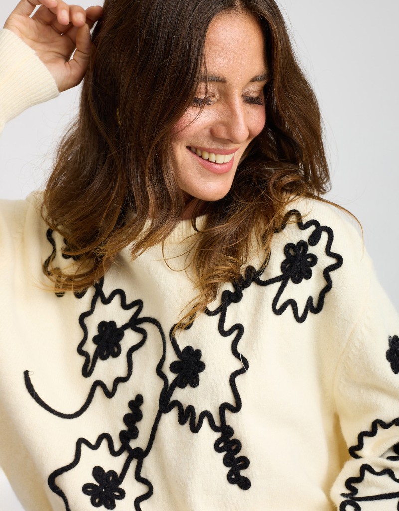 Maglione dal morbido tessuto in tinta unita con lavorazione ricamata di un colore in contrasto. Vestibilità morbida.