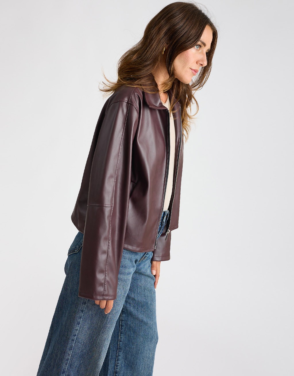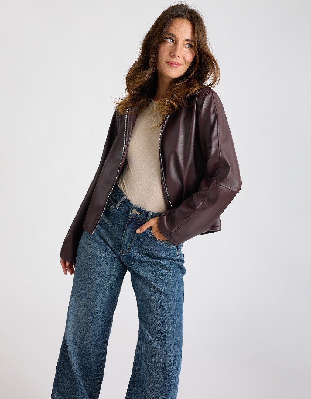 Giubbotto realizzato in finta pelle. Collo a revers ,chiusura frontale con cerniera e cuciture lungo le maniche.