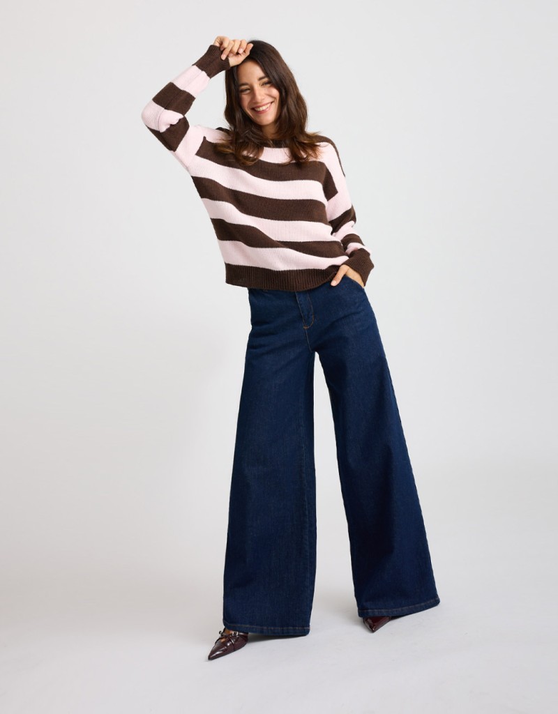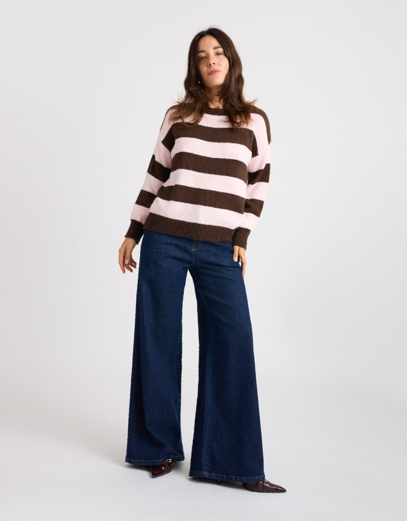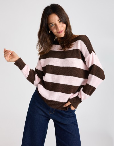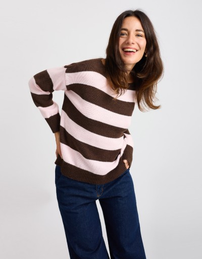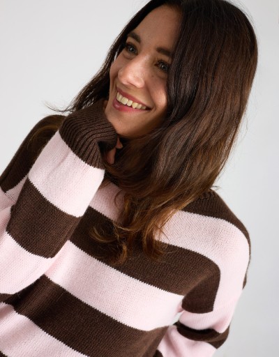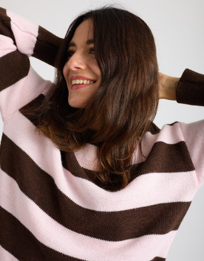Maglione basico dal design essenziale, realizzato in tessuto morbido con fantasia a righe. La presenza di lana e alpaca dona calore e comfort, rendendolo avvolgente e piacevole da indossare. Le linee semplici lo trasformano in un capo versatile, facile da integrare nel guardaroba quotidiano.