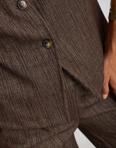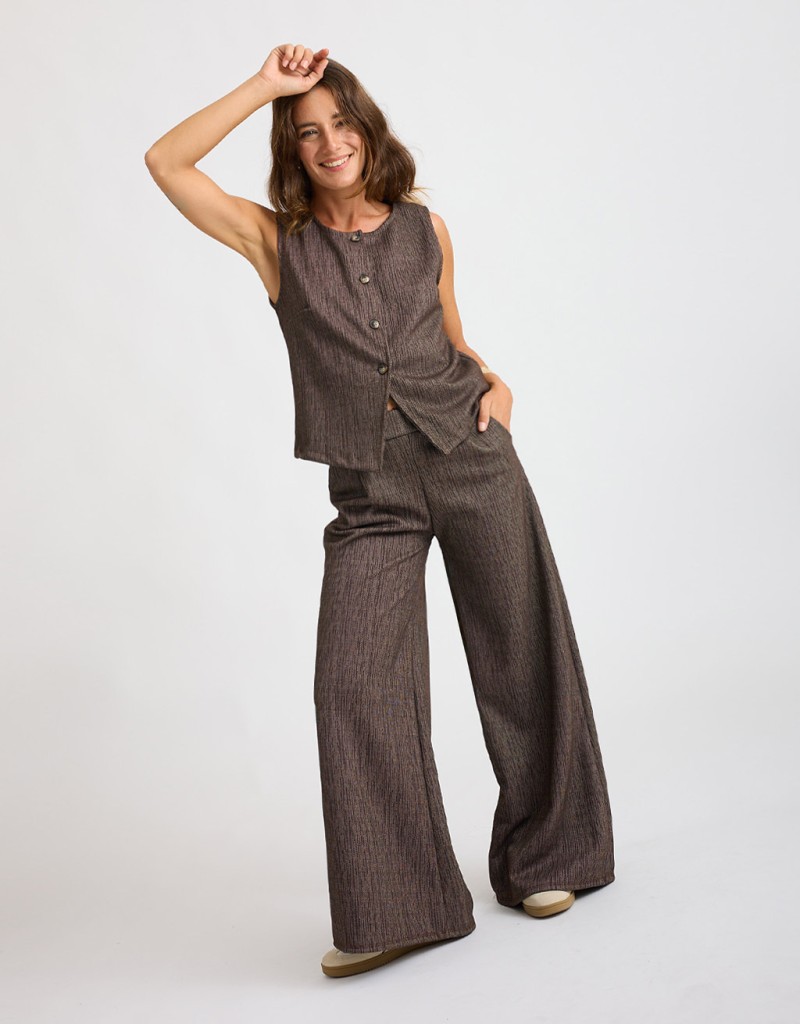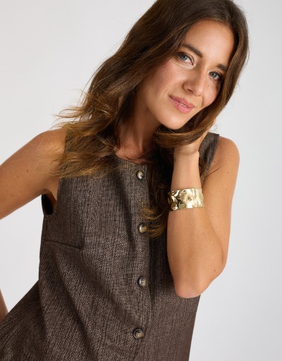 Gilet basico elasticizzato in tonalità melange, con scollo a giro e chiusura a bottoni. Un capo versatile e confortevole, perfetto da indossare da solo o sopra una camicia. Può essere abbinato al pantalone palazzo in mano lana cod.30382 per creare un coordinato raffinato e di tendenza.