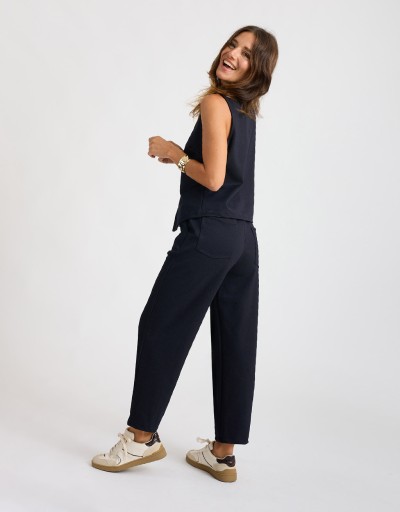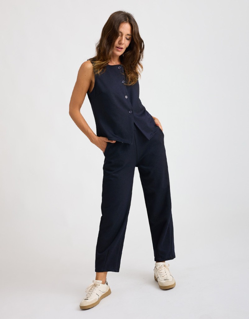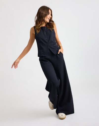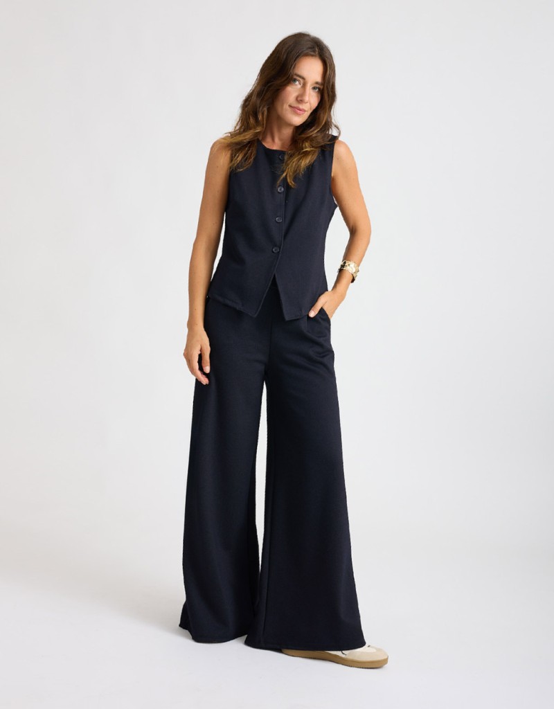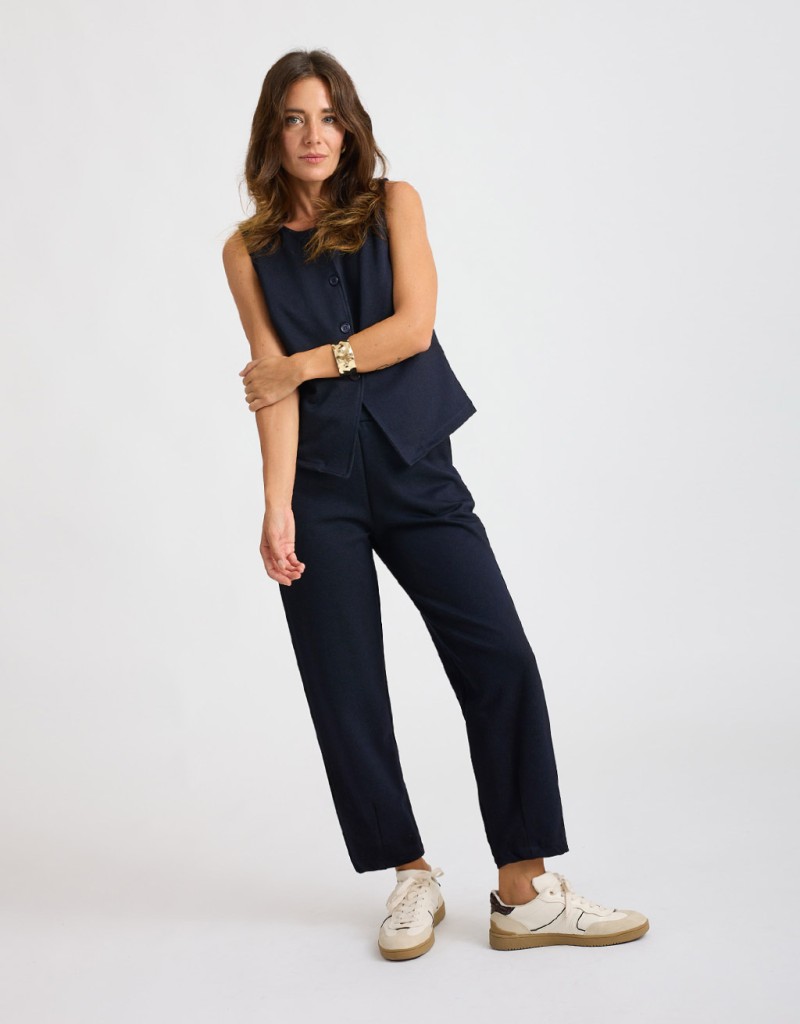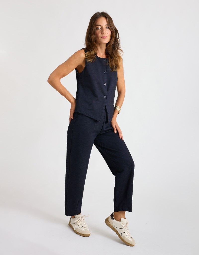 Gilet in tessuto melange con tramatura diagonale, scollatura a giro e chiusura frontale con bottoni. Un capo versatile e confortevole, perfetto da indossare sopra camicie o bluse. Può essere abbinato al pantalone melange cod.30385 con la stessa tramatura per creare un coordinato elegante e moderno.