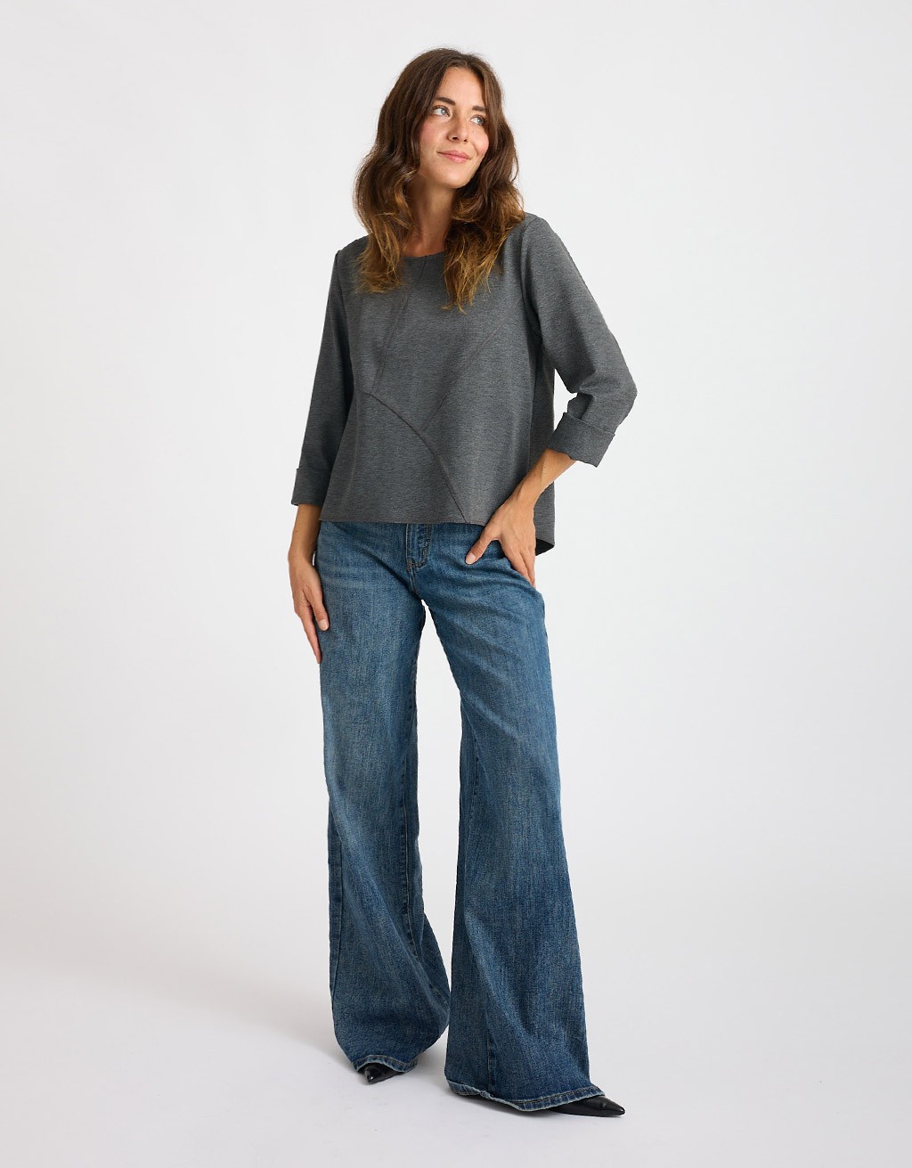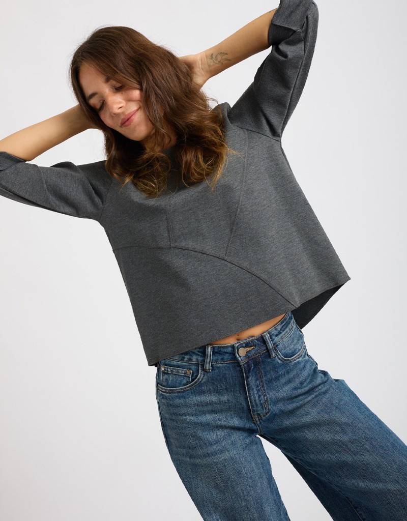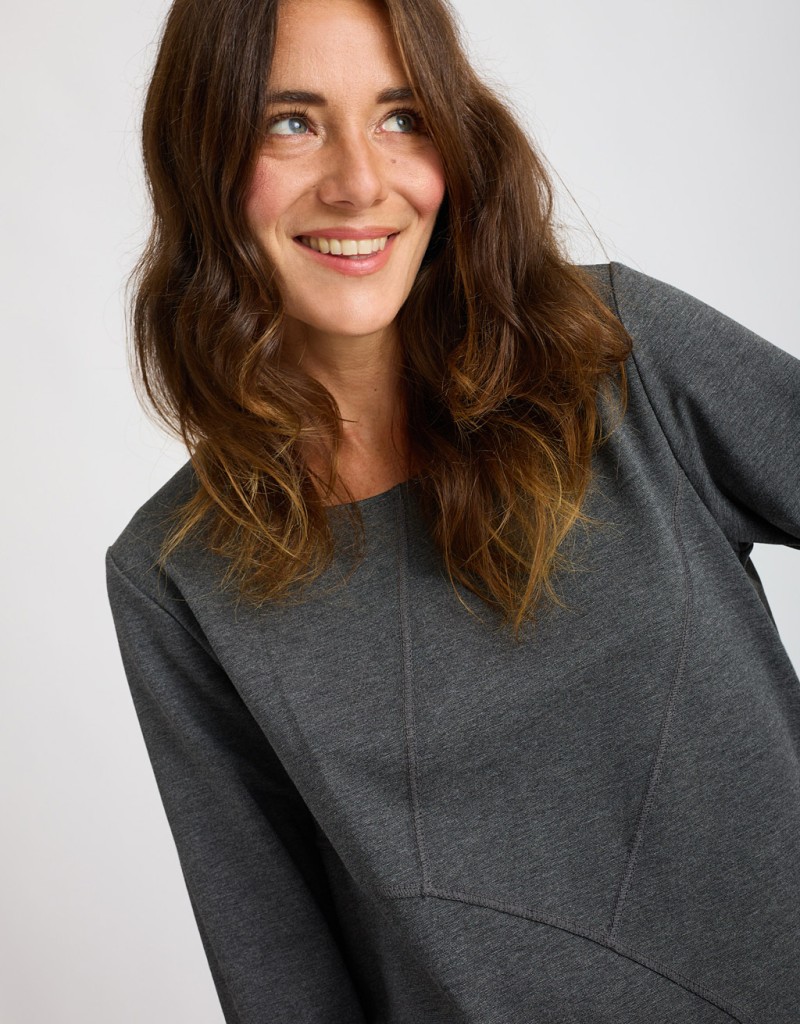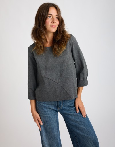 Felpetta pesante in morbido tessuto elasticizzato, manica lunga e dettagli di cuciture in rilievo su tutto il capo. Il fondo presenta punte dietro sulla schiena, aggiungendo un tocco di originalità. Può essere abbinata al pantalone felpetta portafoglio (30471) o al pantalone felpetta con cuciture (30472) per creare un completo coordinato e moderno.