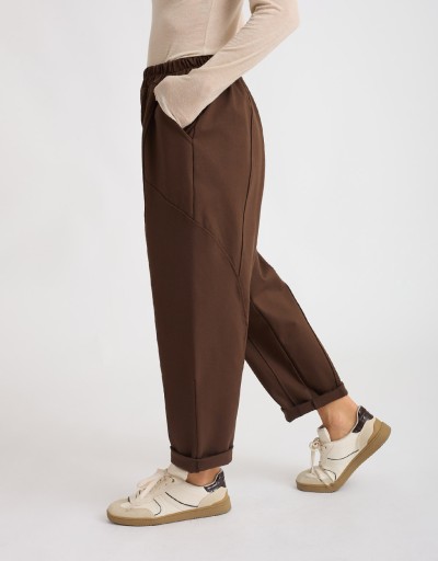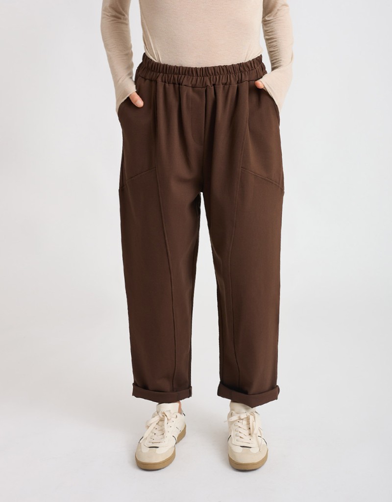 Pantalone in felpa pesante dal tessuto morbido ed elasticizzato, con elastico in vita per una vestibilità adattabile. Presenta tasche laterali e cuciture in rilievo frontali che aggiungono stile. Può essere abbinato alla felpetta cuciture (30470), alla felpetta portafoglio (30469) o al blazer felpetta over (30473) per un completo coordinato moderno e versatile.