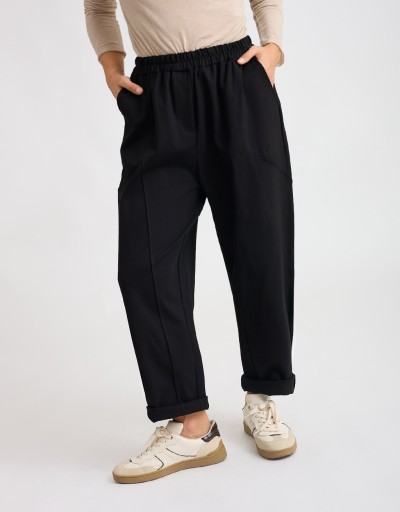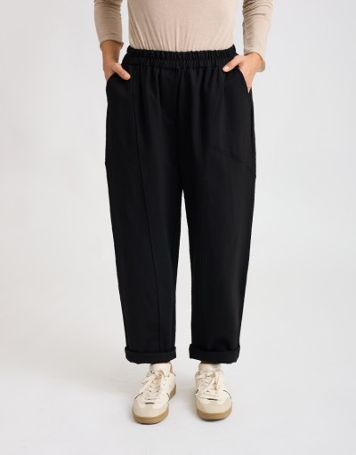 Pantalone in felpa pesante dal tessuto morbido ed elasticizzato, con elastico in vita per una vestibilità adattabile. Presenta tasche laterali e cuciture in rilievo frontali che aggiungono stile. Può essere abbinato alla felpetta cuciture (30470), alla felpetta portafoglio (30469) o al blazer felpetta over (30473) per un completo coordinato moderno e versatile.
