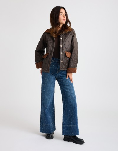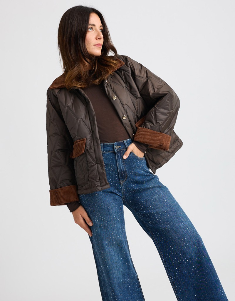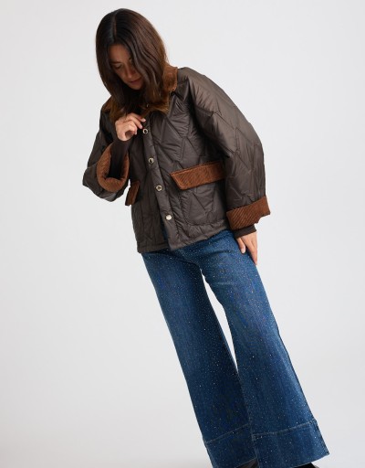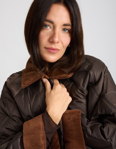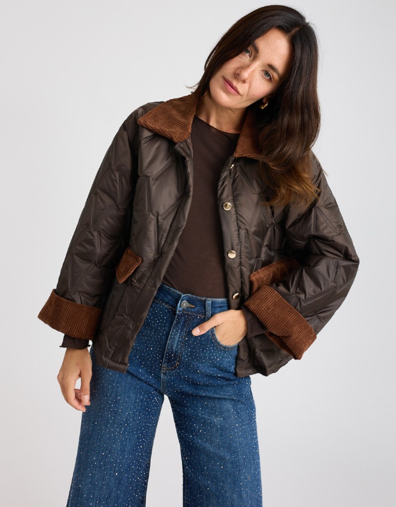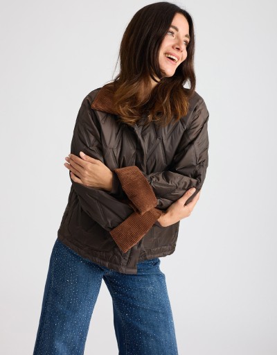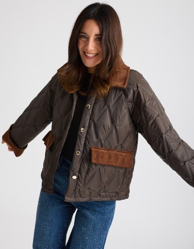 Ecopiumino corto con trapuntatura a rombi, collo a camicia e chiusura frontale con bottoni a pressione color oro. Tasche frontali con patta e inserti in velluto su collo, tasche e polsini donano un tocco elegante. La vestibilità comoda lo rende versatile e pratico, perfetto per proteggersi dal freddo senza rinunciare allo stile.