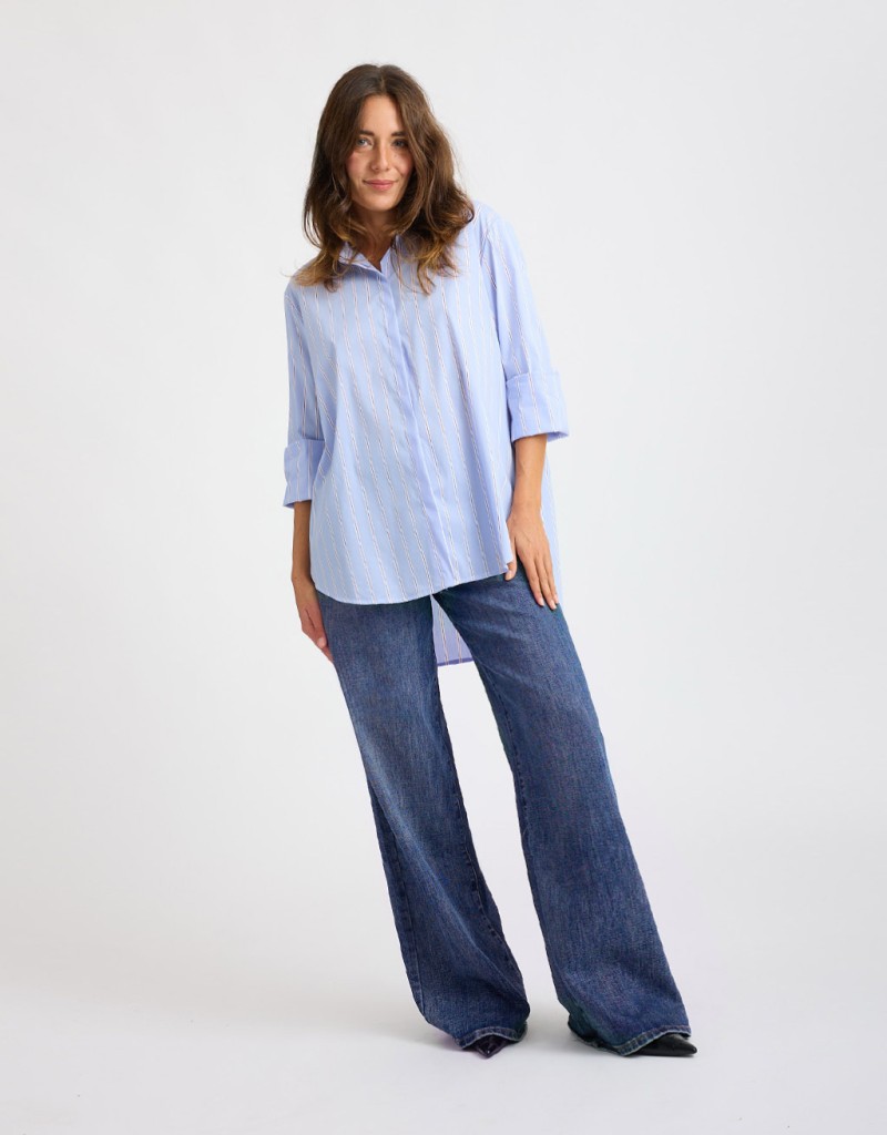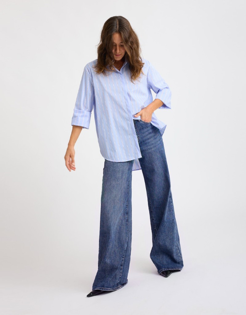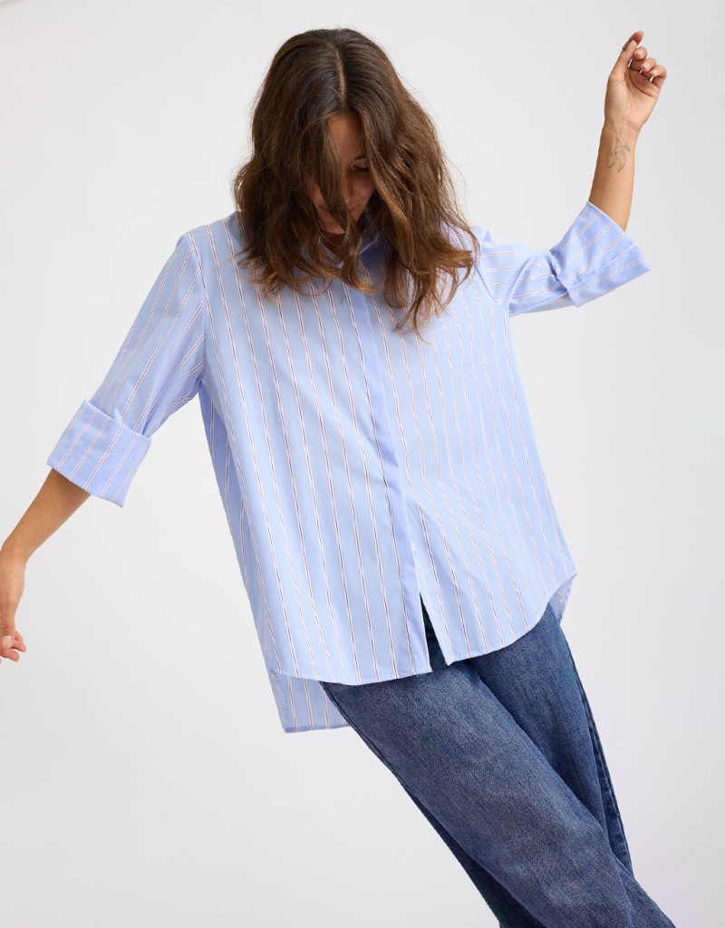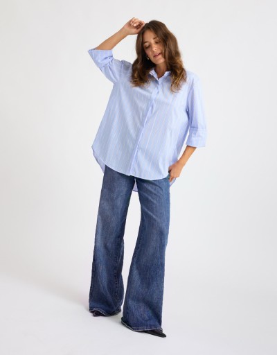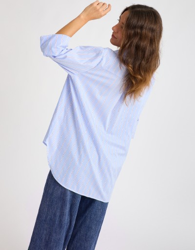 Camicia a manica lunga dal taglio over in morbido misto cotone a righe. Un capo versatile e confortevole, perfetto da indossare da solo o sopra altri capi per aggiungere un tocco di stile rilassato. La linea over la rende adatta a look casual chic o più curati senza rinunciare al comfort.