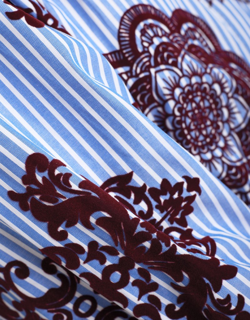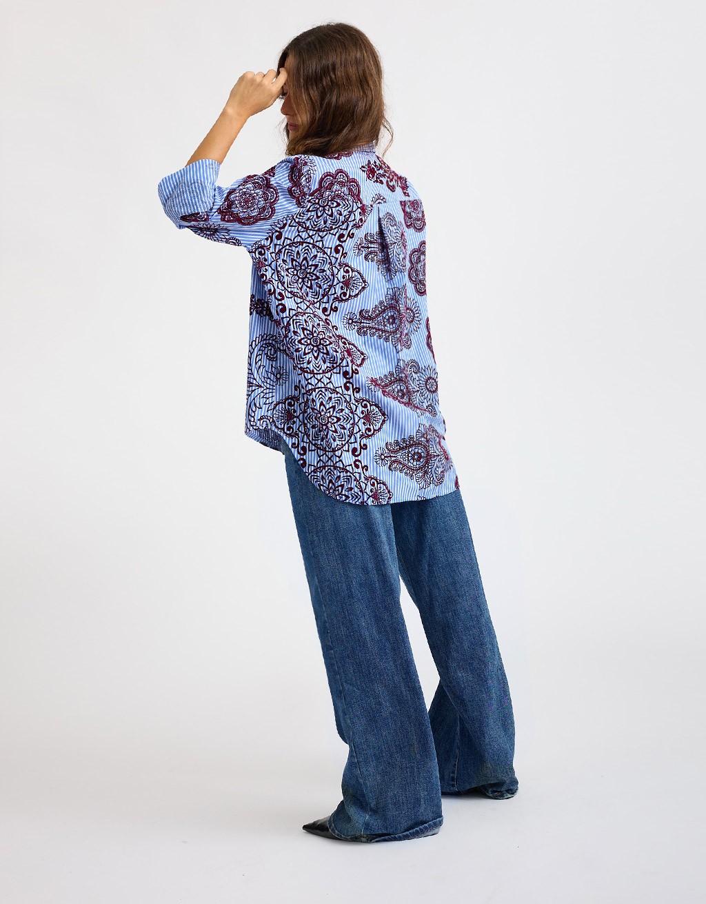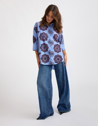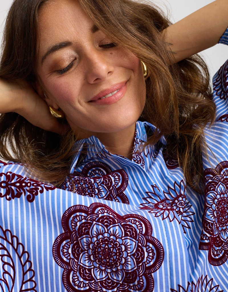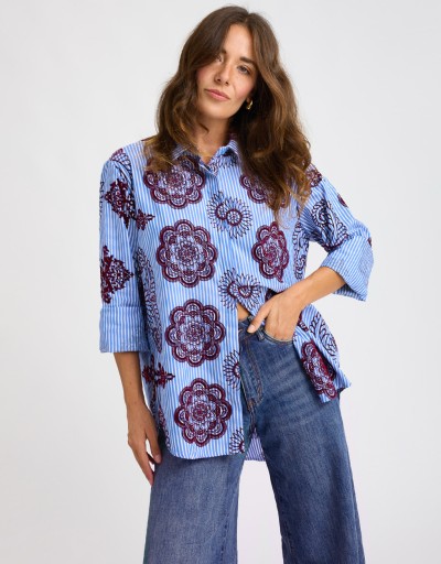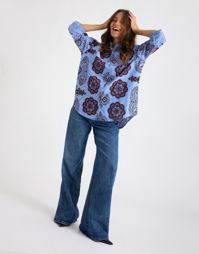 Camicia dal tessuto leggero a righe con dettagli floccati, dal taglio over e manica lunga. Un capo comodo e versatile, perfetto per creare look casual chic o più curati, grazie al mix di leggerezza del tessuto e originalità dei dettagli. Ideale da indossare da sola o sopra altri capi per un effetto stratificato di stile.