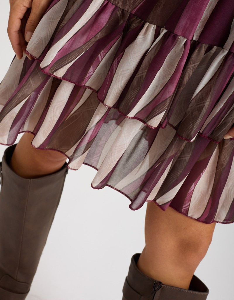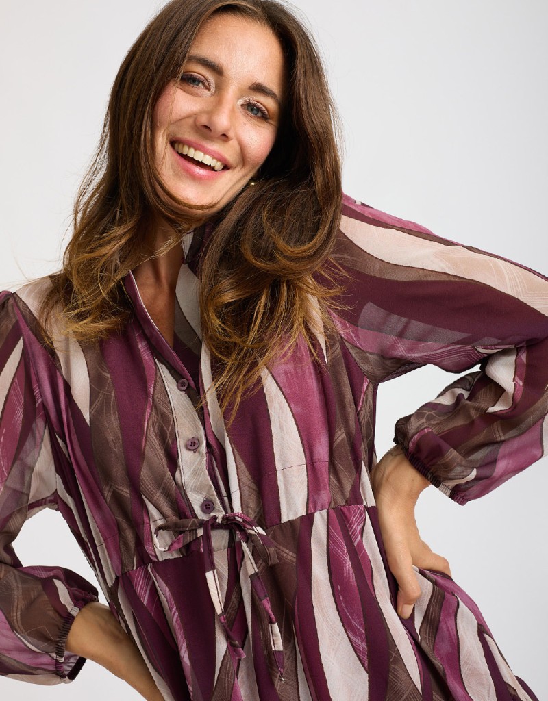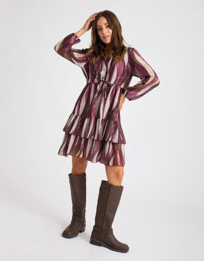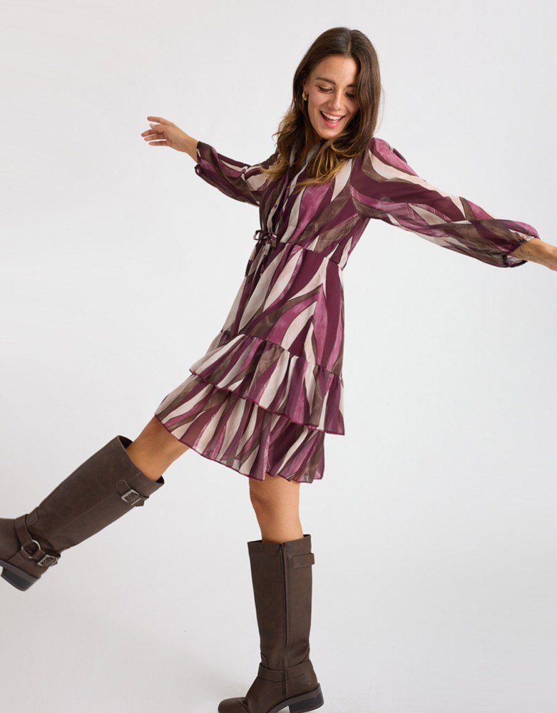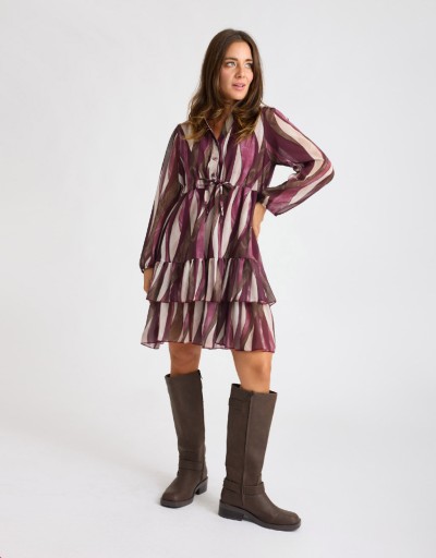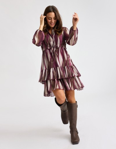 Abito corto in georgette fantasia con collo alla coreana e chiusura frontale con piccoli bottoncini. La coulisse in vita permette di regolare la vestibilità, valorizzando la silhouette, mentre la gonna a due strati sovrapposti crea una balza leggera e femminile. Realizzato in tessuto fluido, è un capo perfetto per look romantici e versatili.
