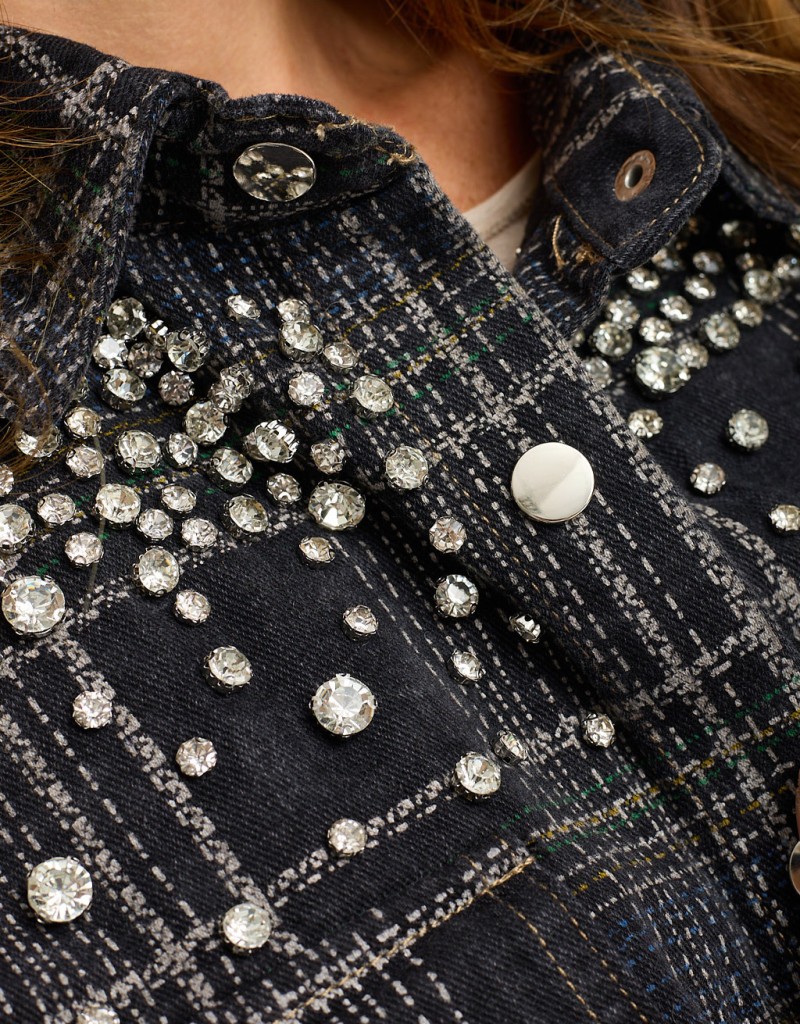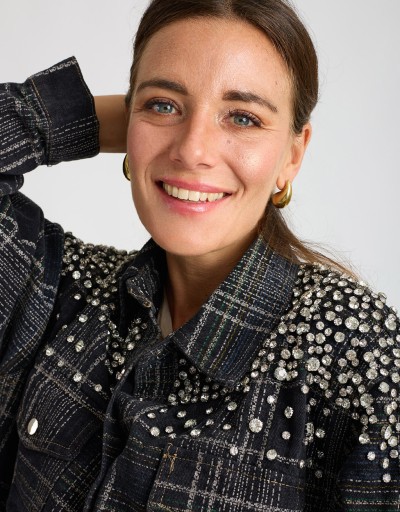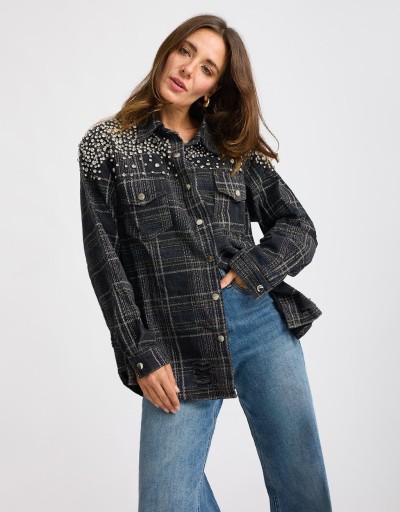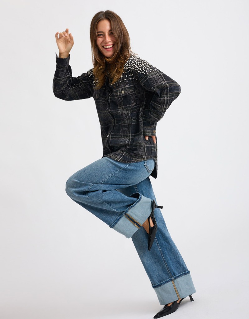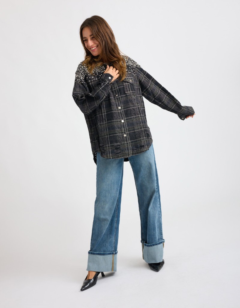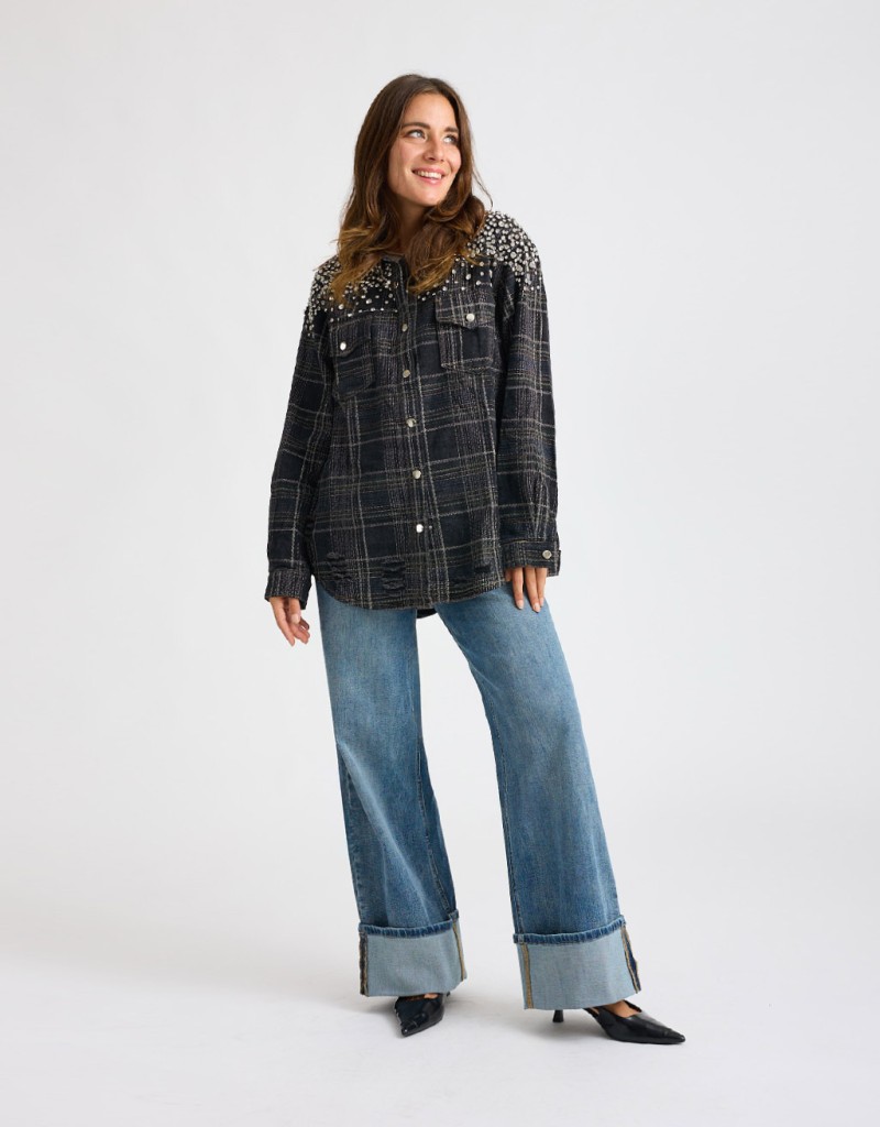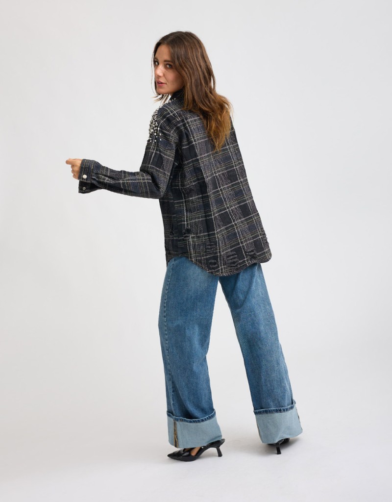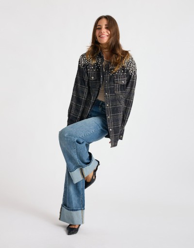 Giacca camicia in morbido cotone fantasia a quadri, dal tocco caldo e confortevole. Caratterizzata da una vestibilità over e da piccoli strappetti sul fondo che aggiungono un tocco grintoso e moderno. Le tasche frontali con patta e la chiusura con bottoni a pressione la rendono pratica, mentre i castoni applicati nella parte superiore donano una nota luminosa e ricercata.