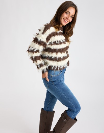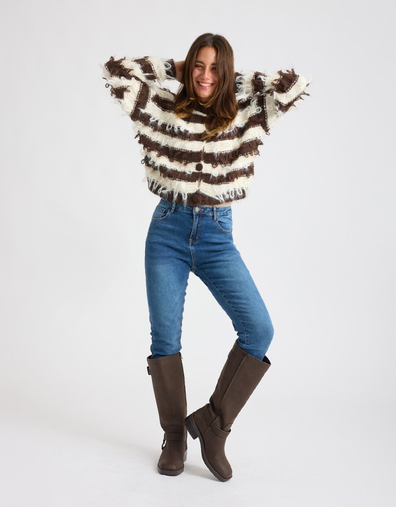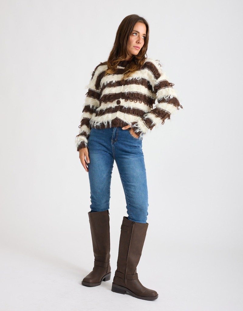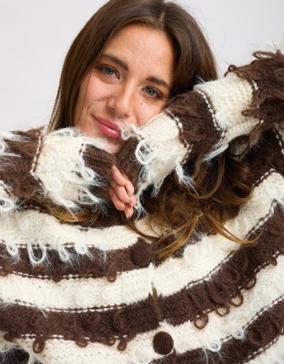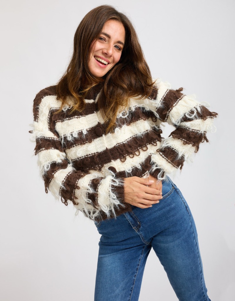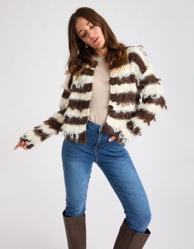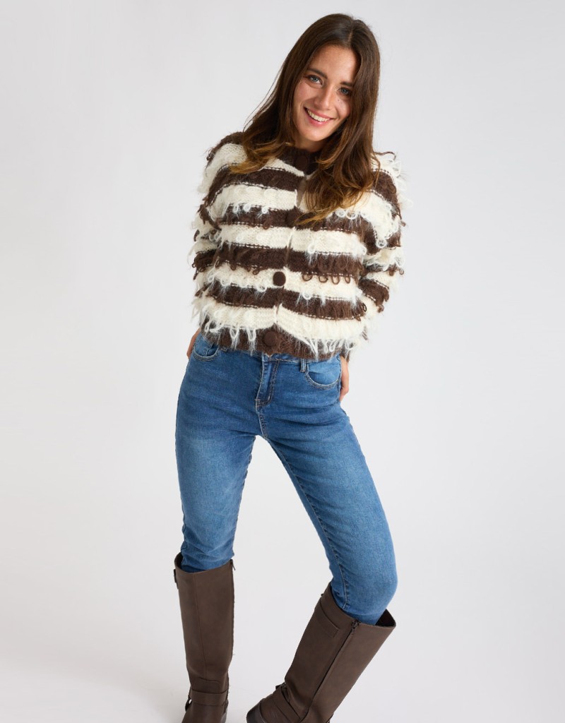 Cardigan dal morbido tessuto a righe “peloso”, caratterizzato da un delicato effetto sfrangiato che dona movimento e originalità. La chiusura frontale con bottoni completa il capo con un tocco classico e versatile. Caldo e avvolgente, è perfetto per la mezza stagione o per aggiungere una nota soffice e trendy ai tuoi outfit quotidiani.