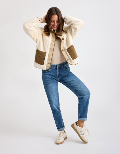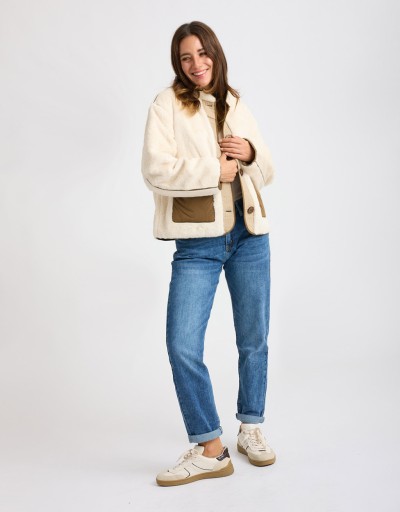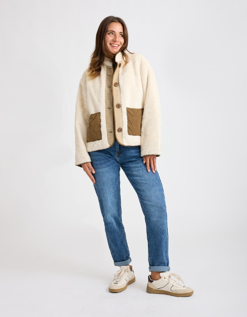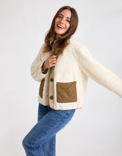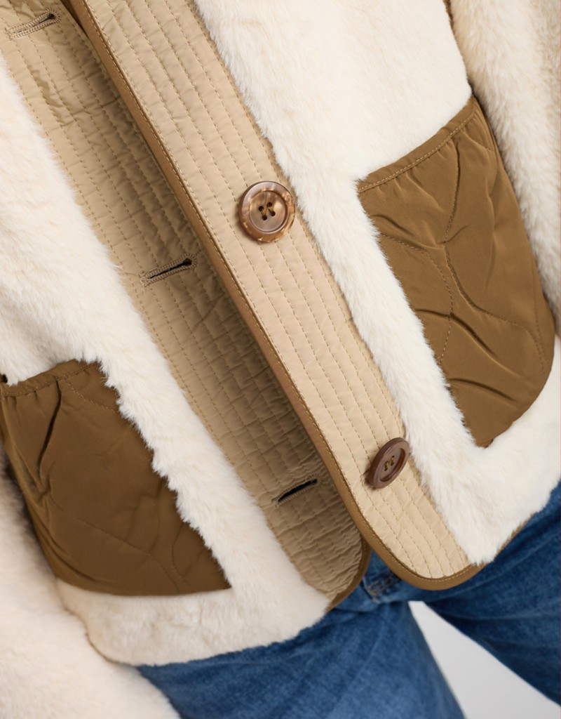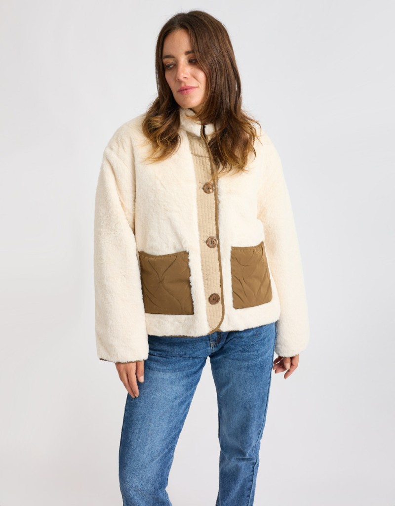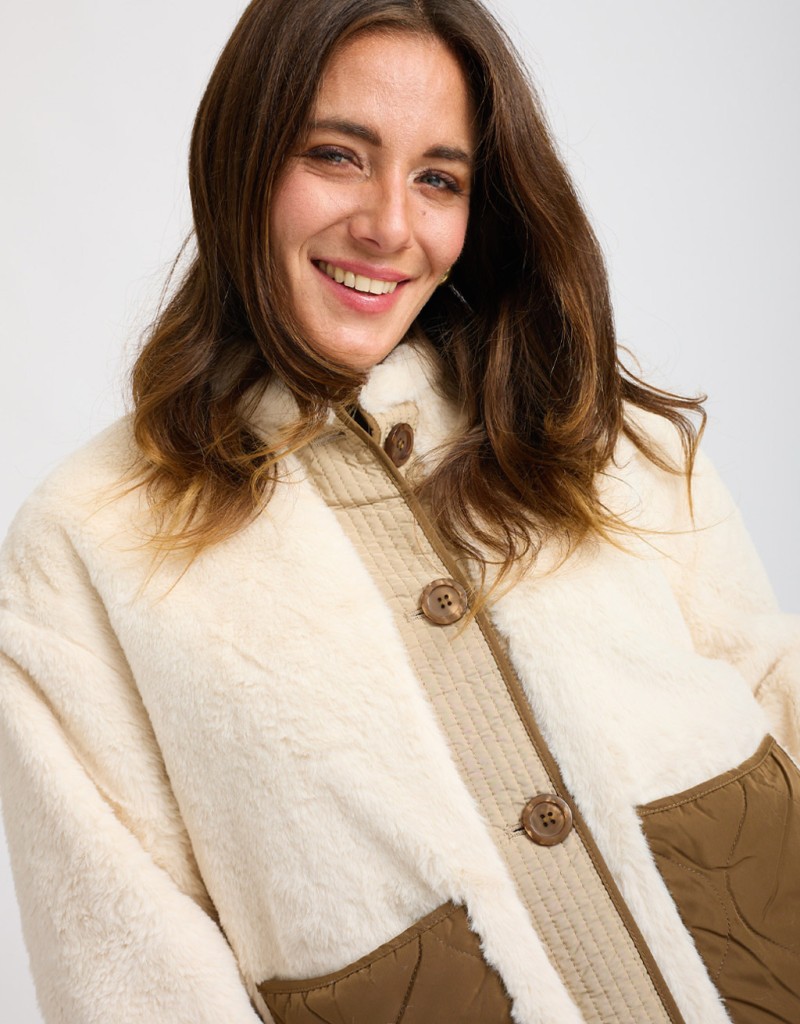 Giubbotto in finta pelliccia morbida color beige, un capo raffinato e avvolgente che unisce eleganza e praticità. Gli inserti in piumino trapuntato donano un tocco contemporaneo mentre il colletto rialzato aggiunge carattere e protezione dal freddo. La chiusura con bottoni completa il design con un tocco pulito e curato, perfetto per le giornate più fredde con stile.