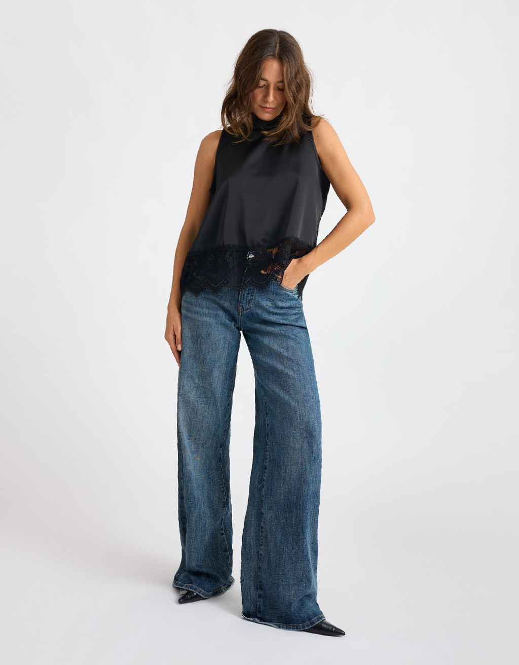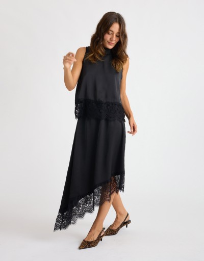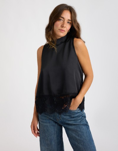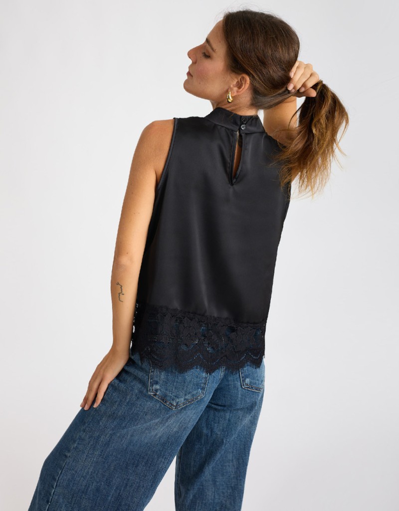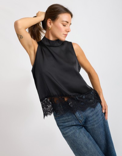 Top smanicato in raso lucido con collo alla coreana e chiusura sul retro con piccoli bottoncini che creano una delicata scollatura a goccia. La fascia in pizzo cucita sul fondo aggiunge un tocco romantico e femminile al design essenziale. Fluido e confortevole, è perfetto per completare look eleganti o dare un accento raffinato a outfit più casual.