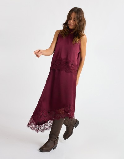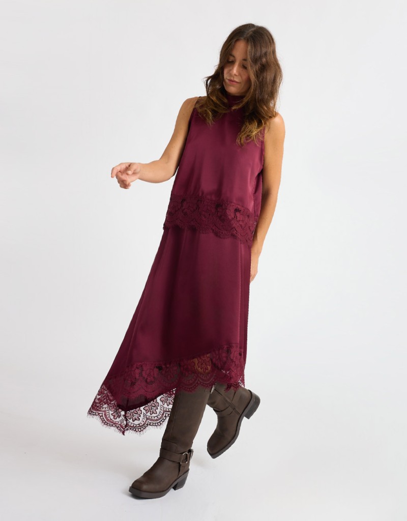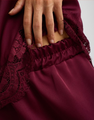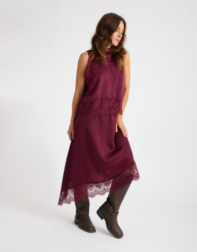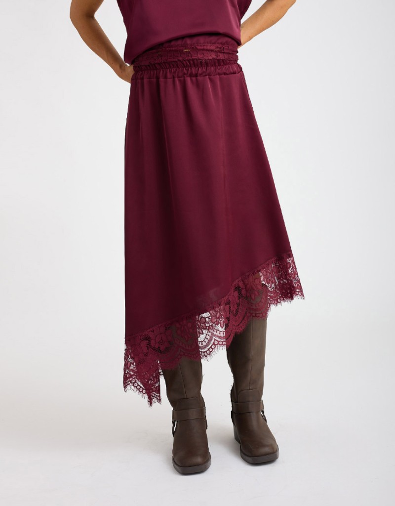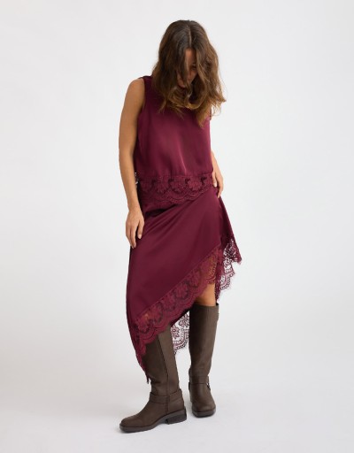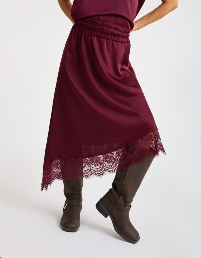Gonna midi in raso lucido dal taglio asimmetrico, leggermente più lunga su un lato per un effetto fluido e raffinato. L’elastico in vita assicura una vestibilità confortevole e adattabile, mentre la fascia in pizzo cucita sul fondo aggiunge un tocco romantico e femminile. Un capo elegante e versatile, perfetto per look sia da giorno che da sera.