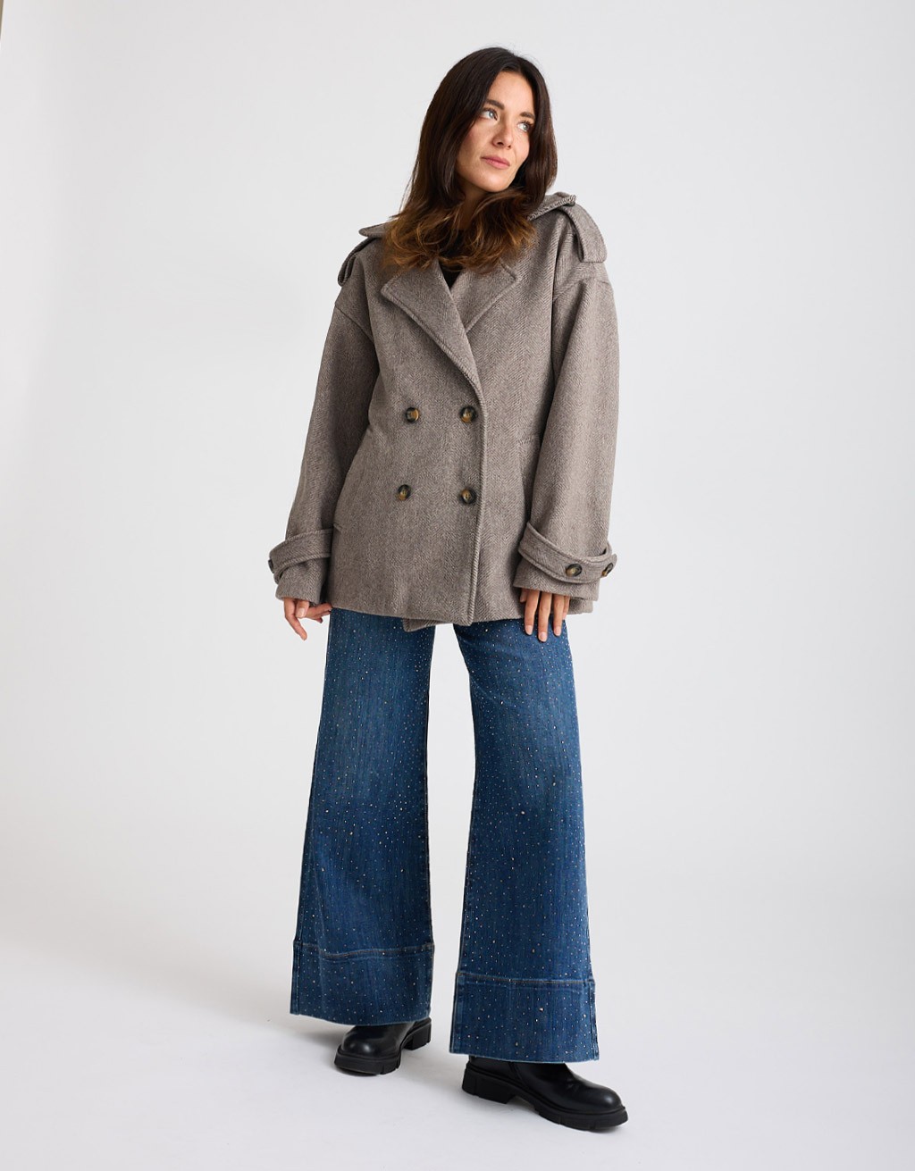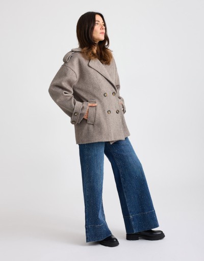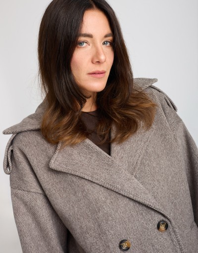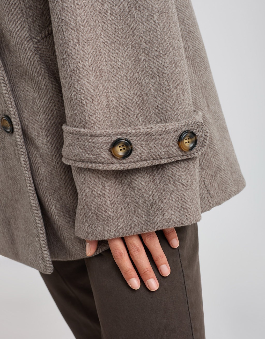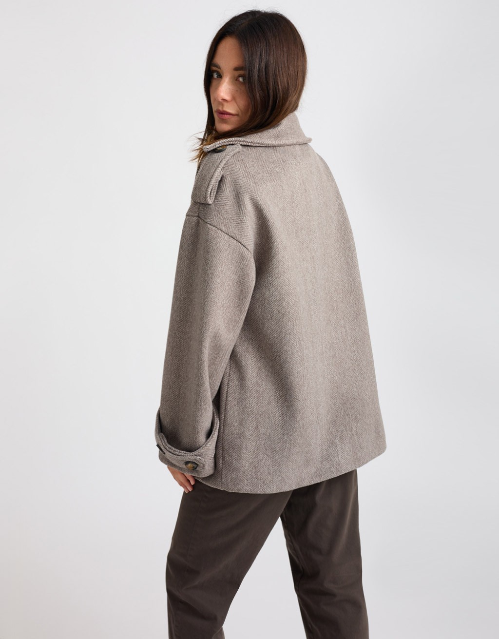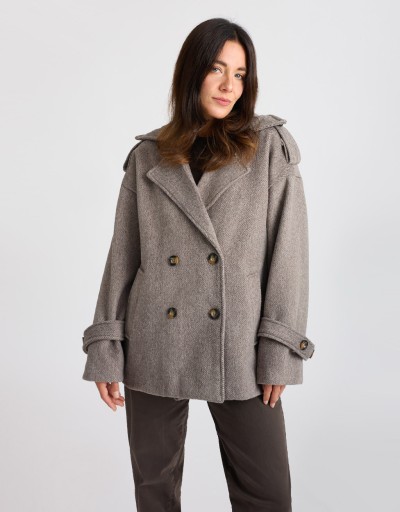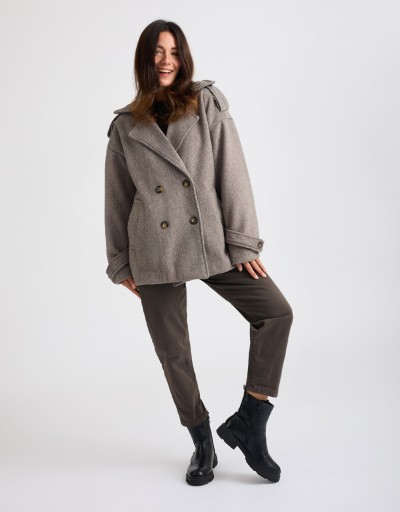 Cappotto corto in morbido e caldo tessuto fantasia spinata, con collo a revers e chiusura frontale a doppiopetto. Le tasche laterali e la fodera cucita all’interno aggiungono praticità e comfort, mentre il taglio corto lo rende versatile e moderno. Un capo elegante e facile da abbinare, perfetto per affrontare le giornate più fredde con stile.