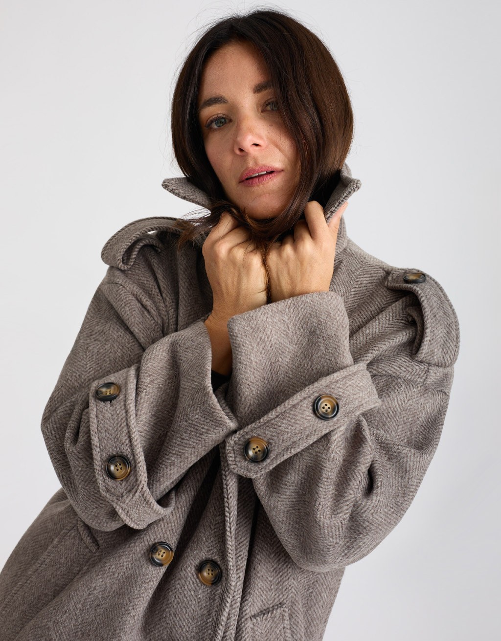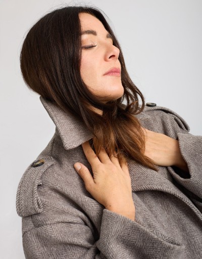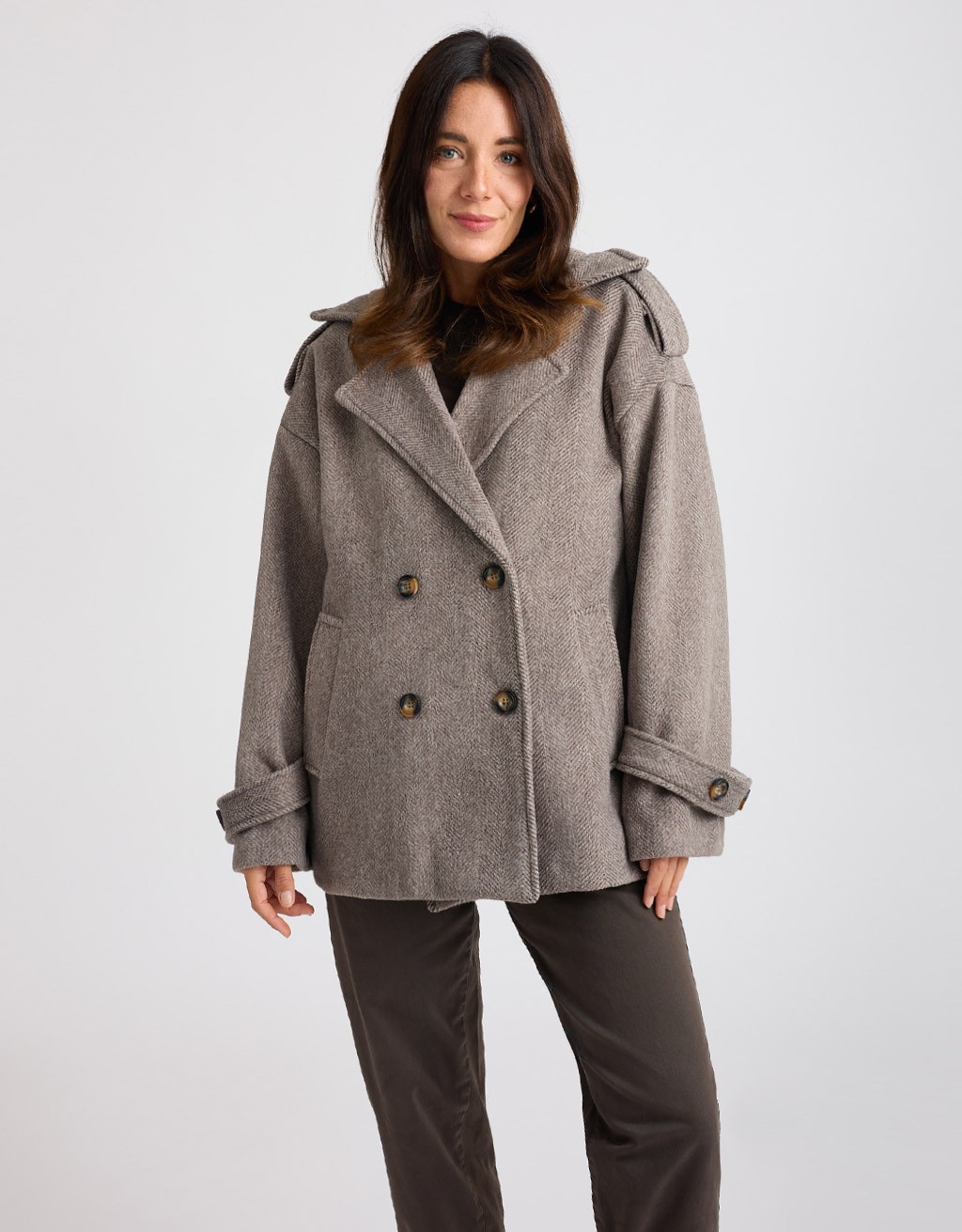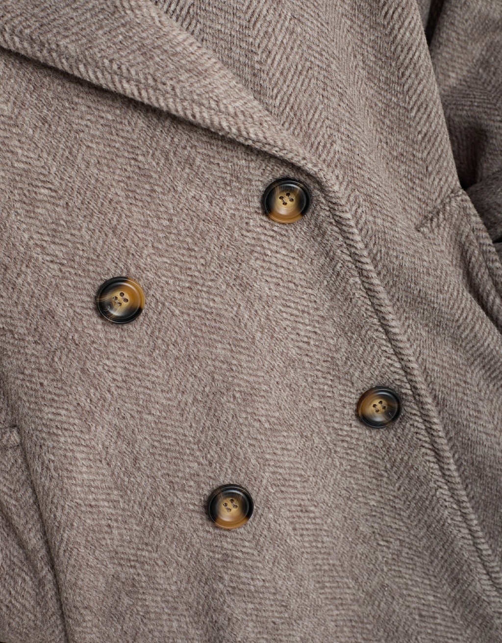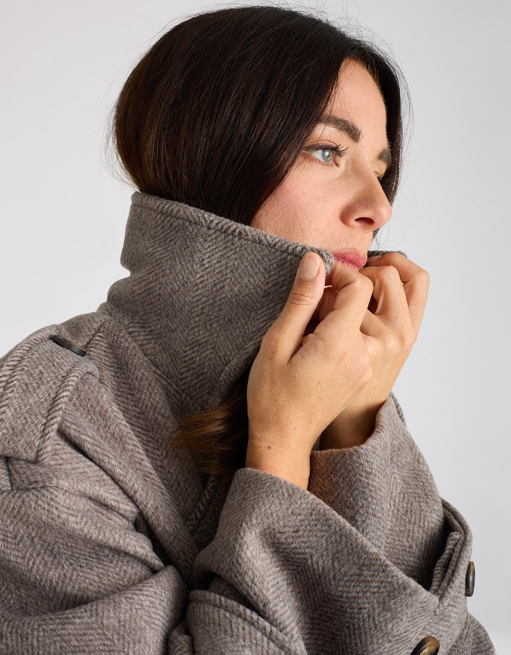 Cappotto corto in morbido e caldo tessuto fantasia spinata, con collo a revers e chiusura frontale a doppiopetto. Le tasche laterali e la fodera cucita all’interno aggiungono praticità e comfort, mentre il taglio corto lo rende versatile e moderno. Un capo elegante e facile da abbinare, perfetto per affrontare le giornate più fredde con stile.