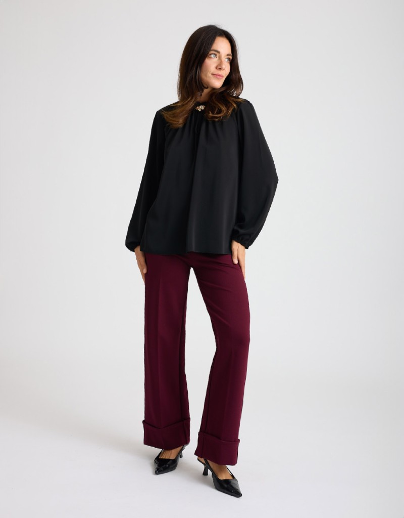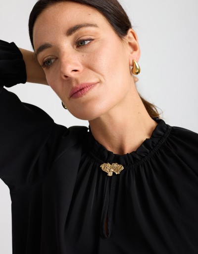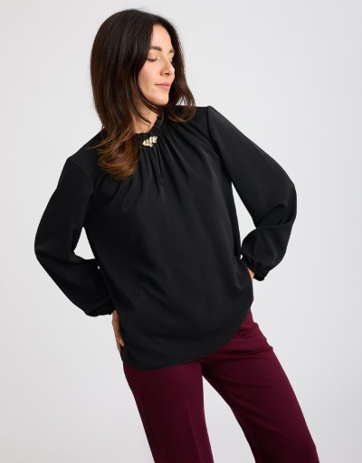 Camicetta in morbido tessuto effetto lucido con elastico nel girocollo che crea una delicata arricciatura sulla scollatura. Il dettaglio di spilla color oro aggiunge un tocco elegante e luminoso, rendendo il capo raffinato ma facile da indossare. La vestibilità comoda e il tessuto fluido la rendono perfetta per look eleganti o casual chic.