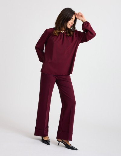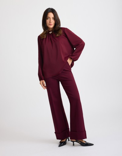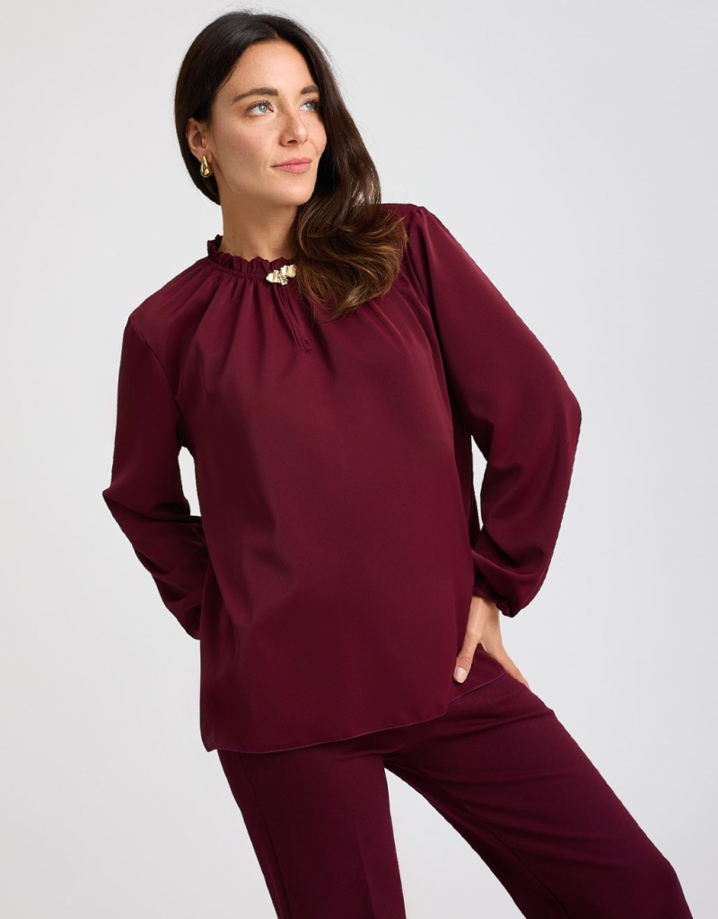Camicetta in morbido tessuto effetto lucido con elastico nel girocollo che crea una delicata arricciatura sulla scollatura. Il dettaglio di spilla color oro aggiunge un tocco elegante e luminoso, rendendo il capo raffinato ma facile da indossare. La vestibilità comoda e il tessuto fluido la rendono perfetta per look eleganti o casual chic.