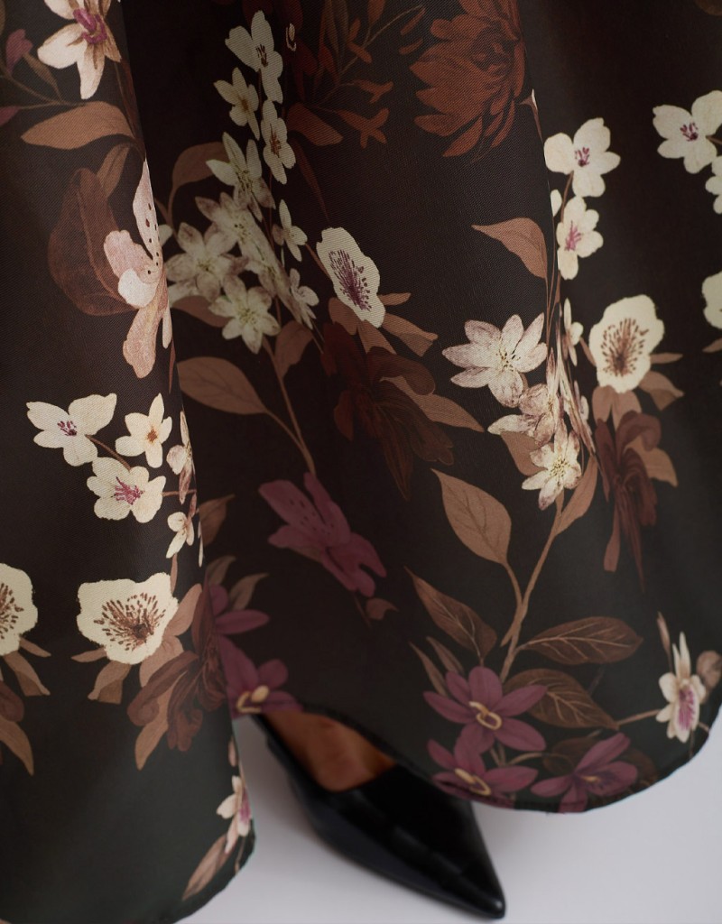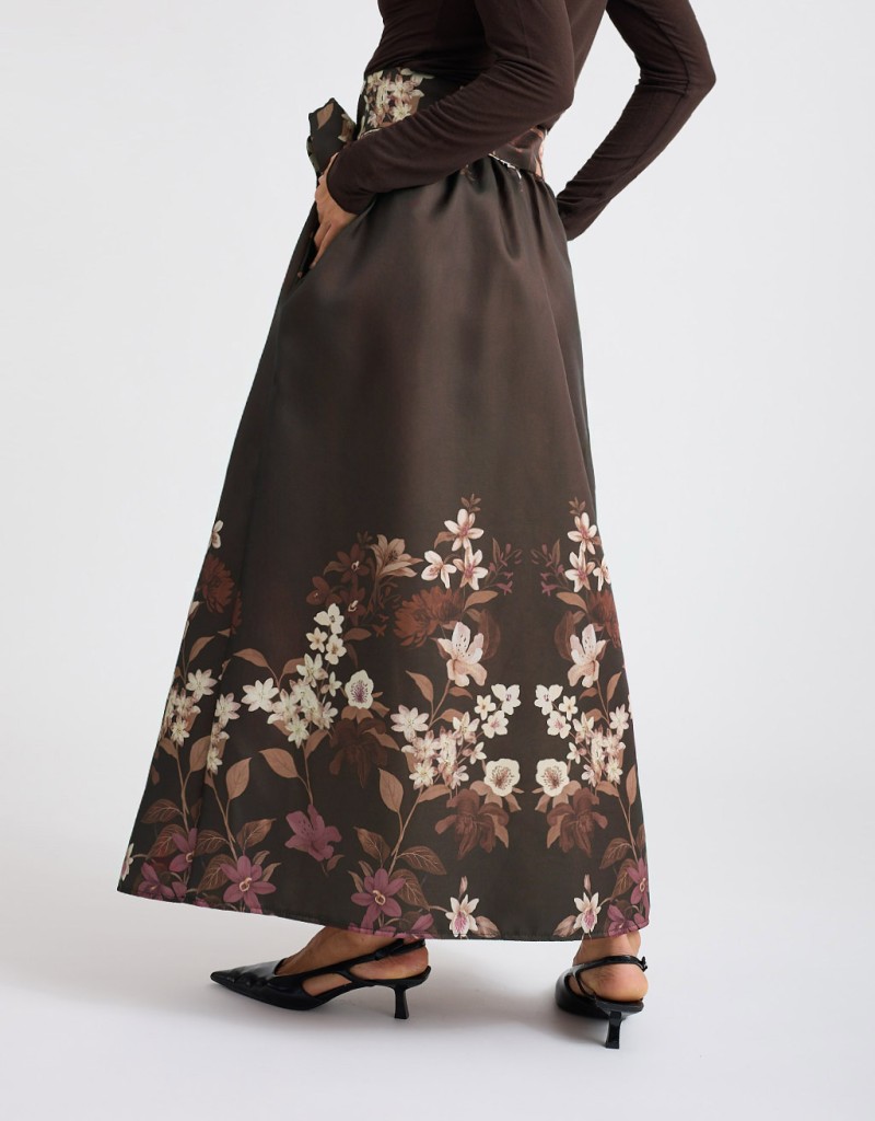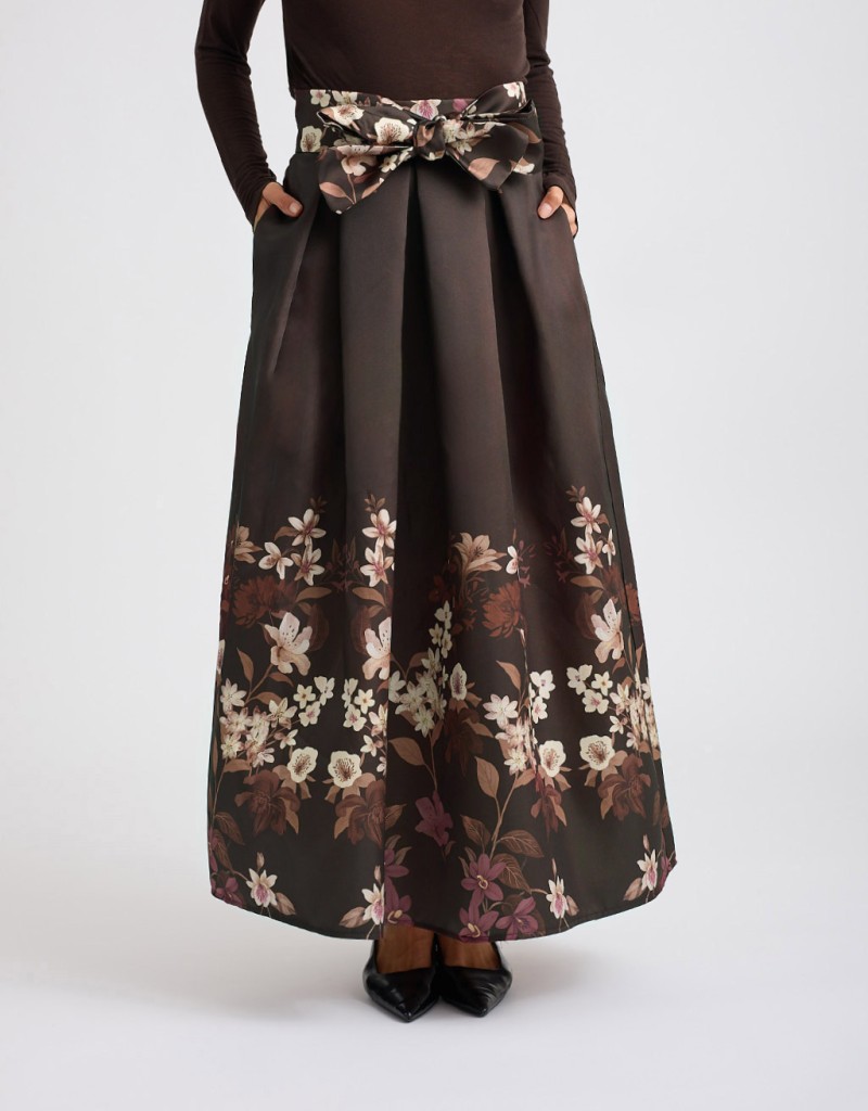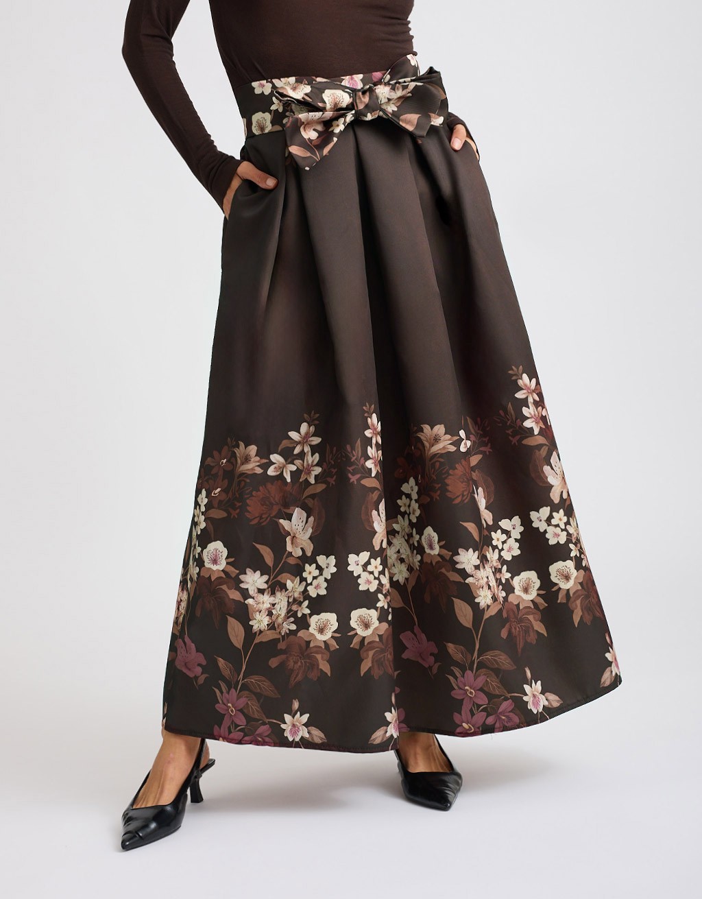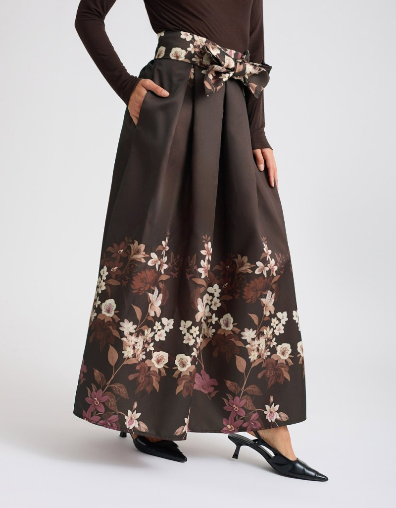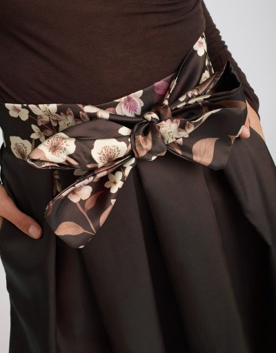 Gonna lunga in tessuto effetto lucido con elegante fantasia floreale. Le pinces frontali e le tasche laterali nascoste aggiungono praticità e un tocco sartoriale, mentre la fascia elastica e la fusciacca dello stesso tessuto regolano la vestibilità valorizzando la silhouette. Il tessuto fluido e luminoso dona movimento al capo, ideale per look femminili e raffinati.