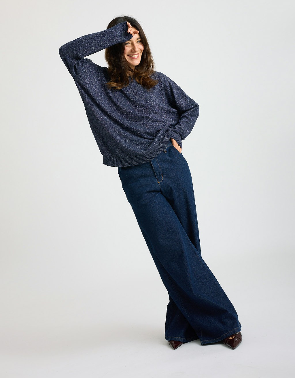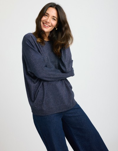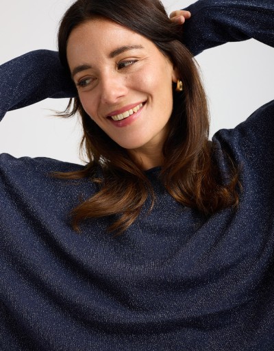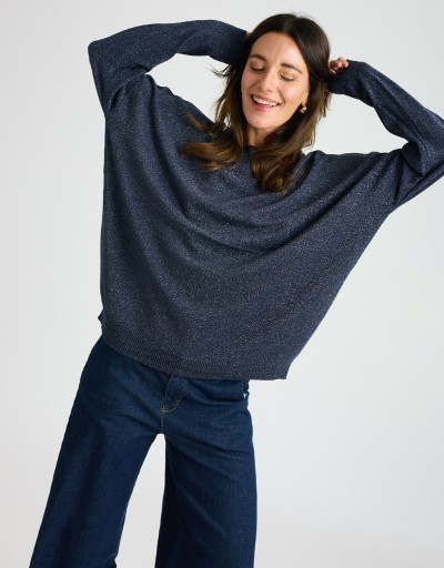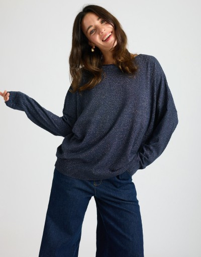 Maglioncino in morbido tessuto elasticizzato con lurex che dona un leggero effetto luminoso. La vestibilità over garantisce comfort e un look contemporaneo, perfetto per chi ama uno stile casual ma curato. Un capo versatile e femminile, ideale da indossare ogni giorno con semplicità e stile.