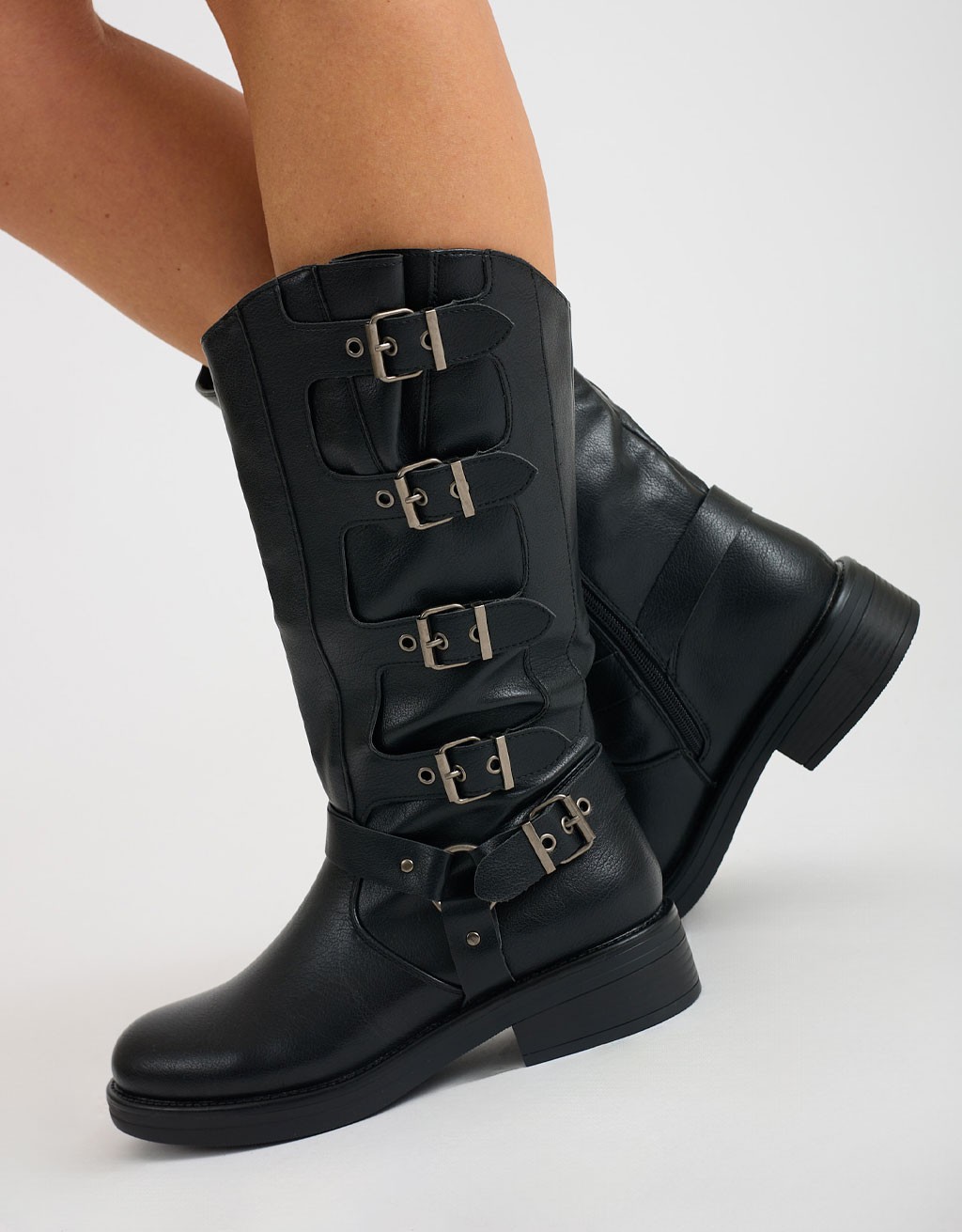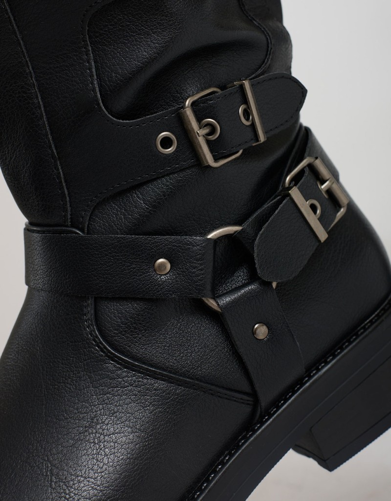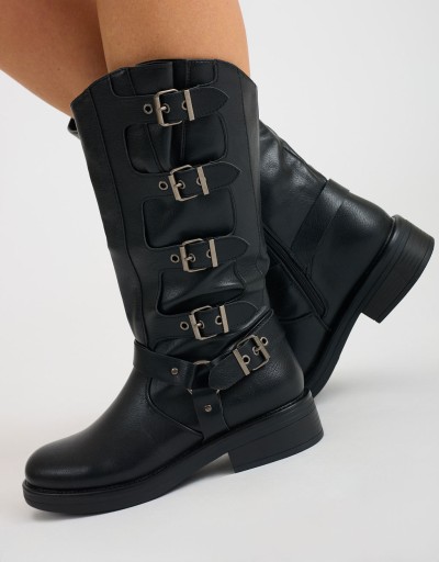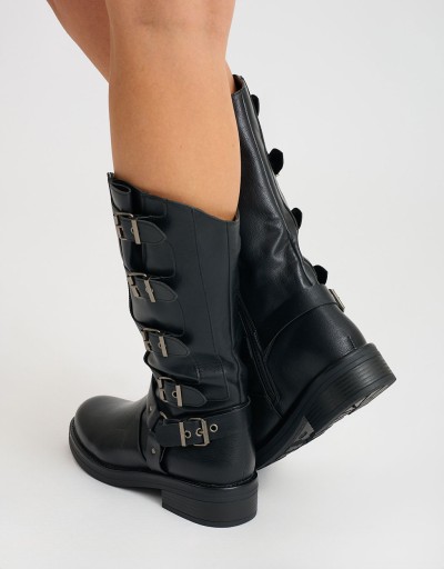 (Ogni 1,00 € speso = 1 punto)Stivale con fibbie dal design grintoso e contemporaneo, realizzato in materiale effetto pelle. Altezza media, suola robusta e dettagli metallici per un look deciso e di tendenza.
