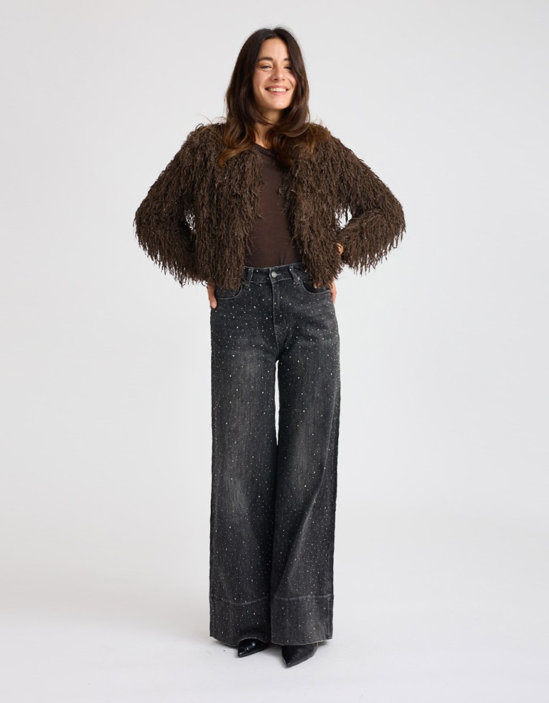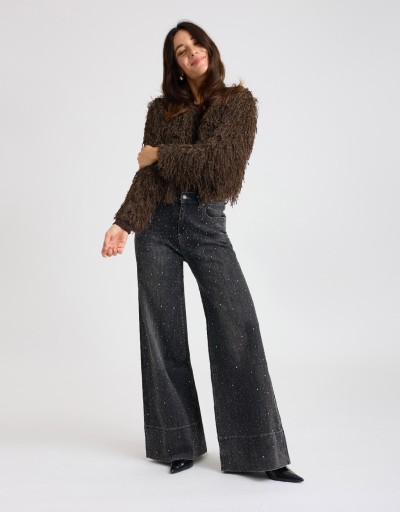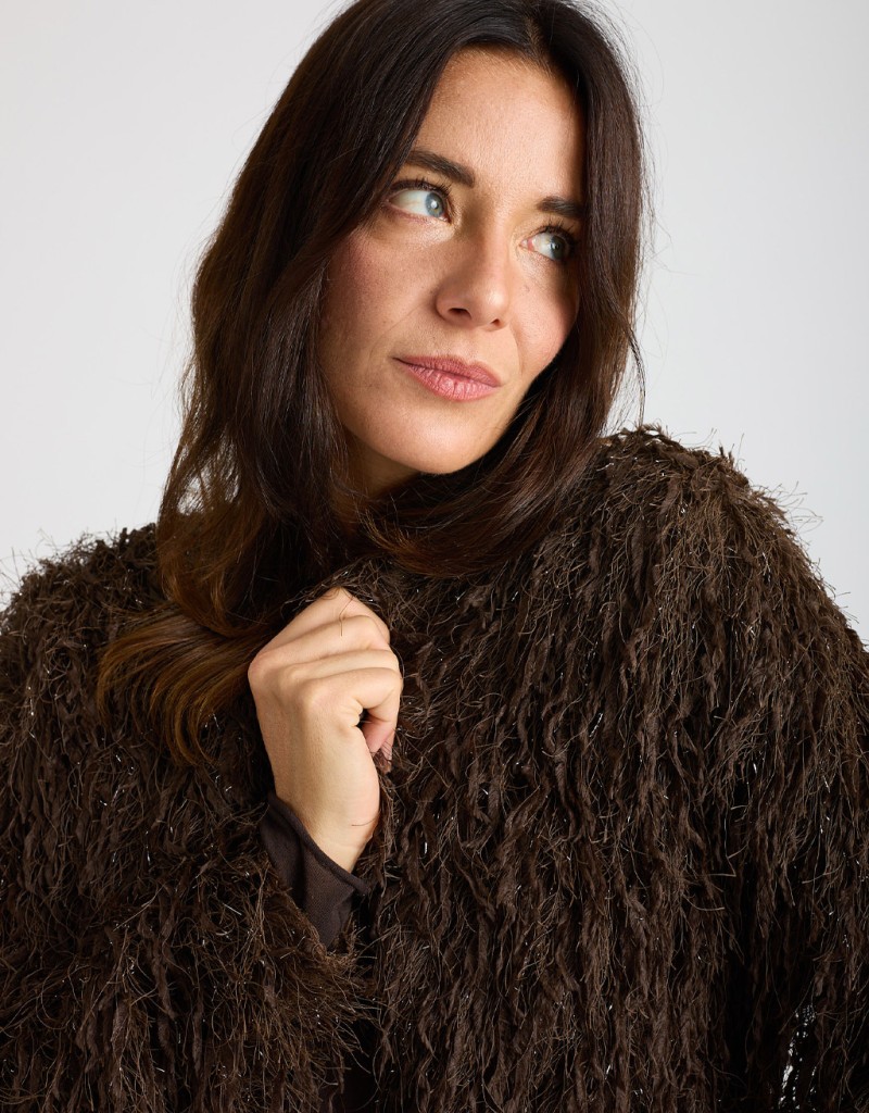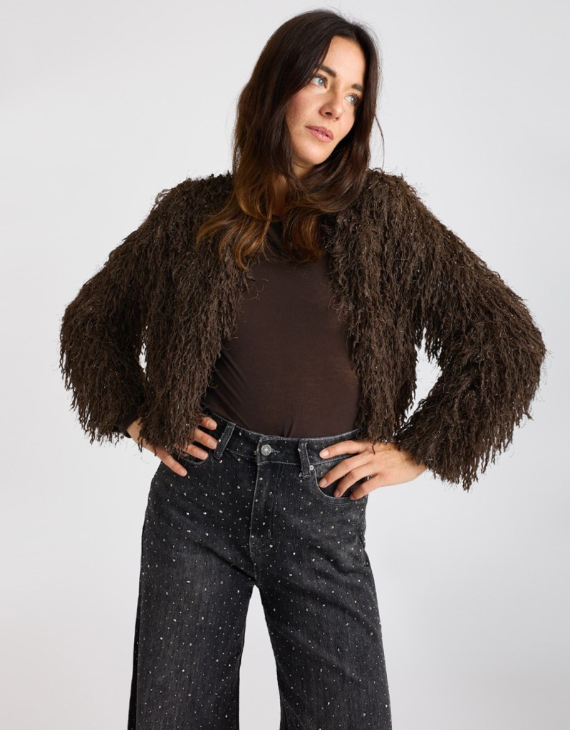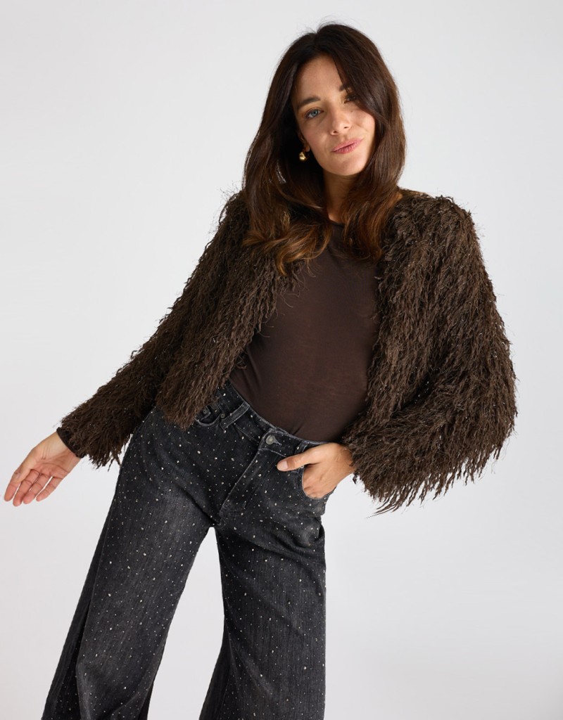 Giacchino corto realizzato in morbido tessuto sfrangiato, con spalline cucite che ne definiscono la struttura e valorizzano la linea. Il modello è aperto sul davanti e presenta una fodera interna in viscosa cucita per garantire comfort e una vestibilità scorrevole. Un capo versatile e di tendenza, perfetto per completare look casual o più eleganti con un tocco sofisticato.