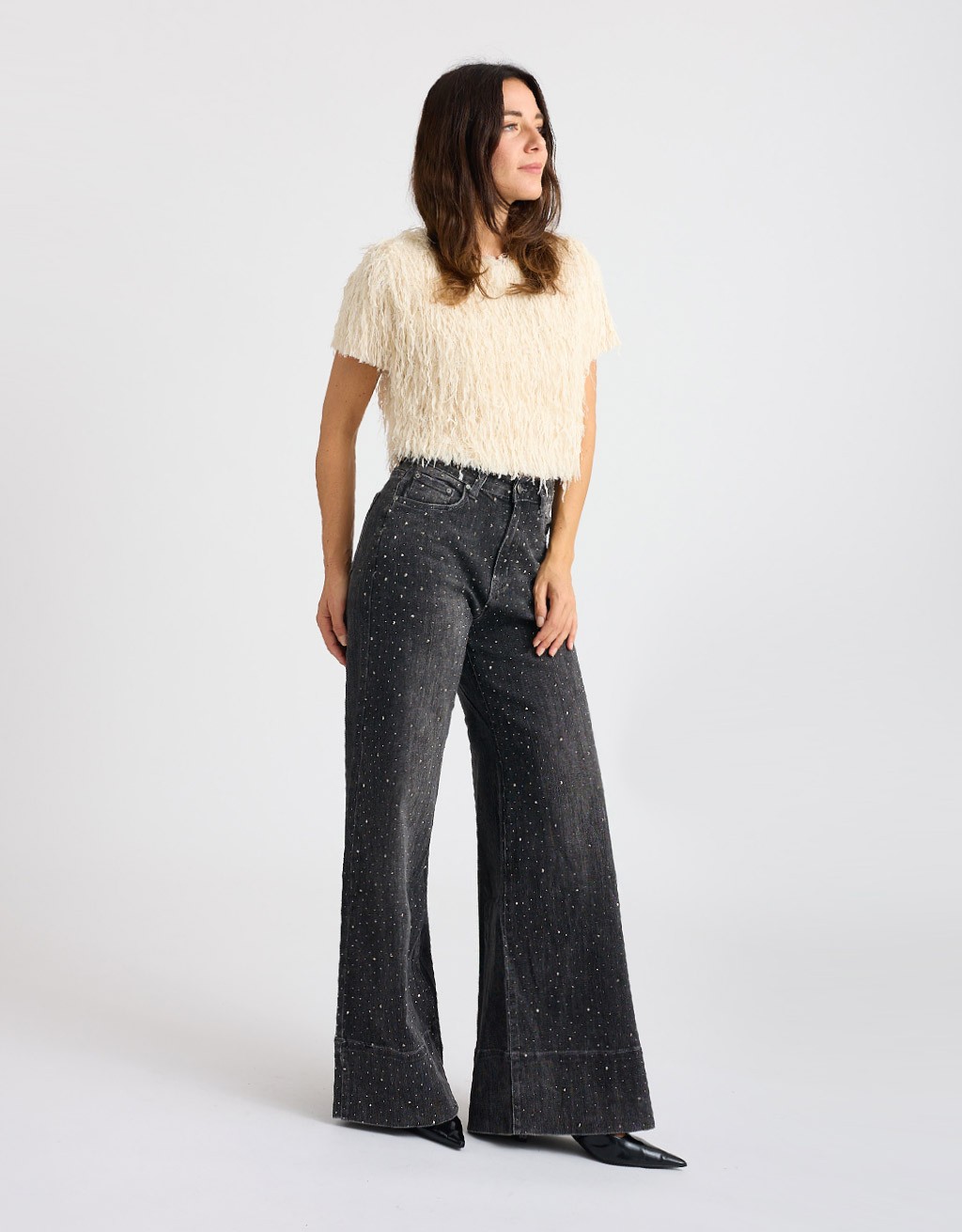 Maglietta corta realizzata in morbido tessuto sfrangiato con lurex, dal tocco delicato e piacevole sulla pelle. Il design a maniche corte e la fodera interna cucita garantiscono comfort e una vestibilità curata. Un capo dal fascino moderno e ricercato, perfetto per aggiungere un tocco originale e raffinato ai tuoi look quotidiani.